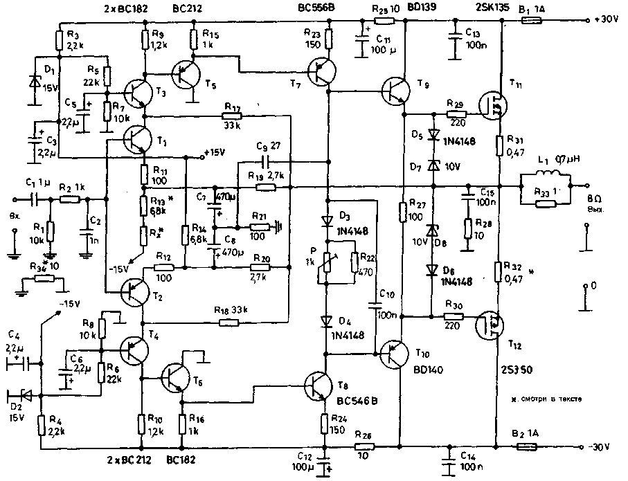 ЭНЦИКЛОПЕДИЯ РАДИОЭЛЕКТРОНИКИ И ЭЛЕКТРОТЕХНИКИ Усилитель Hi-Fi на комплементарных транзисторах. Энциклопедия радиоэлектроники и электротехники Энциклопедия радиоэлектроники и электротехники / Усилители мощности транзисторные Схема усилителя приведена на рис. 1. Через RC-цепочку фильтра нижних частот сигнал попадает на комплементарный входной каскад (Т1, Т2, Т3, Т4). При желании можно увеличить емкость разделительного конденсатора С1, однако делать это имеет смысл только в случае очень низкой граничной частоты звукоизлучающей системы. В эмиттерную цепь входного каскада включен линеаризующий резистор R11 на 100 Ом, к эмиттерам же подключена общая отрицательная обратная связь величиной около 30 дБ. "Внутри" каскада, между коллектором "нижнего" транзистора (Т2) и эмиттером "верхнего" (Т3) действует вторая ("внутренняя") петля обратной связи величиной около 18 дБ. Это означает, что за исключением транзисторов Т1, Т2, обе петли оказывают одинаковое действие на все остальные каскады.