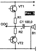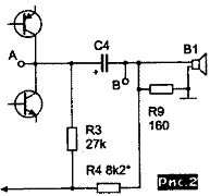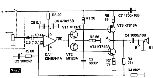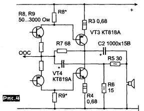На рис. 1 приведена принципиальная схема УНЧ (в скобках указаны выводы микросхемы, задействованные во втором канале), если магнитола действительно, без обмана, стереофоническая. С имеющегося в автомагнитоле регулятора громкости сигнал подводится к прямому входу микросхемы DA1 - операционного усилителя с большим коэффициентом усиления, запасом по верхним частотам, стабилизатором питания входного каскада и защитой выхода от перегрузки. Эти свойства двухканальной микросхемы позволили простым путем избавиться от помех по питанию во входном каскаде и просто осуществить стабилизацию выхода по постоянному напряжению, не заботясь о живучести микросхемы. С выхода ИМС сигнал подан на базы двух германиевых транзисторов различной проводимости фазоинверсного каскада VT1, VT2, таким путем искажения типа "ступенька" подавлены без подбора элементов. Эмиттеры упомянутых транзисторов соединены со средней точкой резисторов R1, R2 делителя питающего напряжения для ограничения токов и защиты всех транзисторов данного канала от перегорания. С коллекторов VT1 и VT2 различные полуволны сигнала попадают на базы выходных транзисторов VT3 и VT4, закрепленных на общем радиаторе. В эмиттеры выходных транзисторов включены резисторы R6 и R7, ограничивающие токи в цепях выхода и выходных транзисторов. Эти же резисторы ограничивают сквозной ток при установке в схему неисправного - "пробитого" транзистора. Переменная составляющая выходного сигнала через конденсатор С4 подводится к головке В1. Следует заметить, что "экономить" на емкости этого конденсатора нельзя! Для работы всех каскадов в линейном режиме необходимо по имеющимся головкам В1 ограничить "басы" снижением емкости конденсатора С1 так, чтобы выросла громкость воспроизведения, но не были заметно подавлены нижние частоты. Эту операцию лучше выполнять, прослушивая звучание в салоне автомобиля. Чем больше мы ограничим нижние частоты, которые на плохих головках очень слабо воспроизводятся, тем больше вырастет максимальная неискаженная мощность звука, и снизятся интермодуляционные искажения слышимых частот "неслышимыми" - не воспроизводимыми головками. Отрицательная обратная связь по постоянному и переменному напряжению с выхода на инвертирующий вход передается с делителя R3, R4, подбором R4 выводим режим усилителя на половину питающего напряжения в точке "А". На рис. 2 приведена улучшенная схема этого делителя, в которой R4 соединен по постоянному напряжению с "корпусом", а по переменному - с динамической головкой. При такой схеме подачи обратной связи звуковые искажения на нижних частотах уменьшаются. Резистор R9 здесь нужен для сохранения режима усилителя при отключении динамических головок. Глубину отрицательной обратной связи по звуковым частотам и коэффициент усиления схемы регулируем резистором R5 так, чтобы звучание приемника, а также кассеты со слабым уровнем записи приводило при верхнем положении регулятора громкости к равномерному ограничению осциллограммы, снятой в точке "В" (в это время должны прослушиваться искажения звука). При такой настройке искажения в различных режимах работы не будут слишком большими и, а то же время, будет небольшой запас громкости. В связи с широкополосностью микросхемы и применением низкочастотных германиевых транзисторов для подавления возбуждения по высо