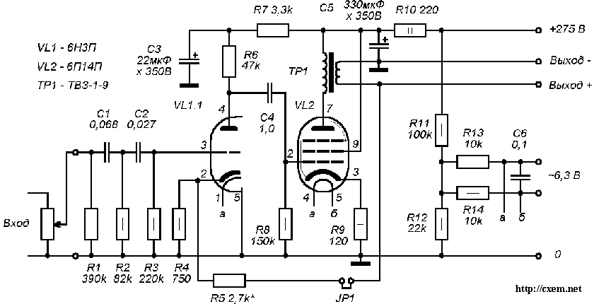 ЭНЦИКЛОПЕДИЯ РАДИОЭЛЕКТРОНИКИ И ЭЛЕКТРОТЕХНИКИ Ламповый УМЗЧ начального уровня. Энциклопедия радиоэлектроники и электротехники Энциклопедия радиоэлектроники и электротехники / Усилители мощности ламповые За многие годы техника звукоусиления накопила огромное количество технических решений, позволяющих получать великолепные результаты, однако несмотря ни на что многие конструкторы (не только радиолюбители, но и серьезные фирмы) вновь и вновь возвращаются к истокам - максимально простым с точки зрения схемотехники, но в то же время максимально эффективным решениям, позволяющим получать качественное звучание. Одно из таких направлений конструирования - постройка УМЗЧ на вакуумных лампах. (УМЗЧ - Усилитель Мощности Звуковой Частоты). Однако и здесь надо отдавать должное - несмотря на кажущуюся простоту электрических схем, получить "достойное" звучание удается не каждому. Но если опытному радиолюбителю неудача принесет лишь еще одну монетку в его копилку опыта, то для начинающего данная проблема, будучи его собственными силами неразрешима, может надолго лишить его желания заниматься конструированием. Впрочем, это уже из области психологии... :) Вниманию начинающих кострукторов предлагается весьма простой для повторения, а самое главное - некапризный и достаточно качественный ламповый УМЗЧ, в котором использованы распространенные лампы и детали, широко применявшиеся в свое время в телевизорах и радиоприемниках. Усилитель разрабатывался как оконечный (т.е. не имеющий в своем составе ни регуляторов тембра, ни каких-либо других узлов, таких как коммутаторы, коректирующие предусилители и т.п.) и изначально предназначался для усиления сигнала, поступающего со звуковой платы компьютера, однако весьма неплохие (субъективно) характеристики позволяют его использовать и для усиления сигнала с других, более "серьезных" источников (CD-проигрыватель, проигрыватель виниловых дисков, магнитофон и т.п.) Принципиальная схема одного канала усилителя показана на рис. 1 Усилитель двухкаскадный. Первый каскад построен на одной половинке двойного триода 6Н3П (VL1) и представляет собой классический каскад усилителя напряжения. Вторая половинка лампы использована во втором канале усилиеля.