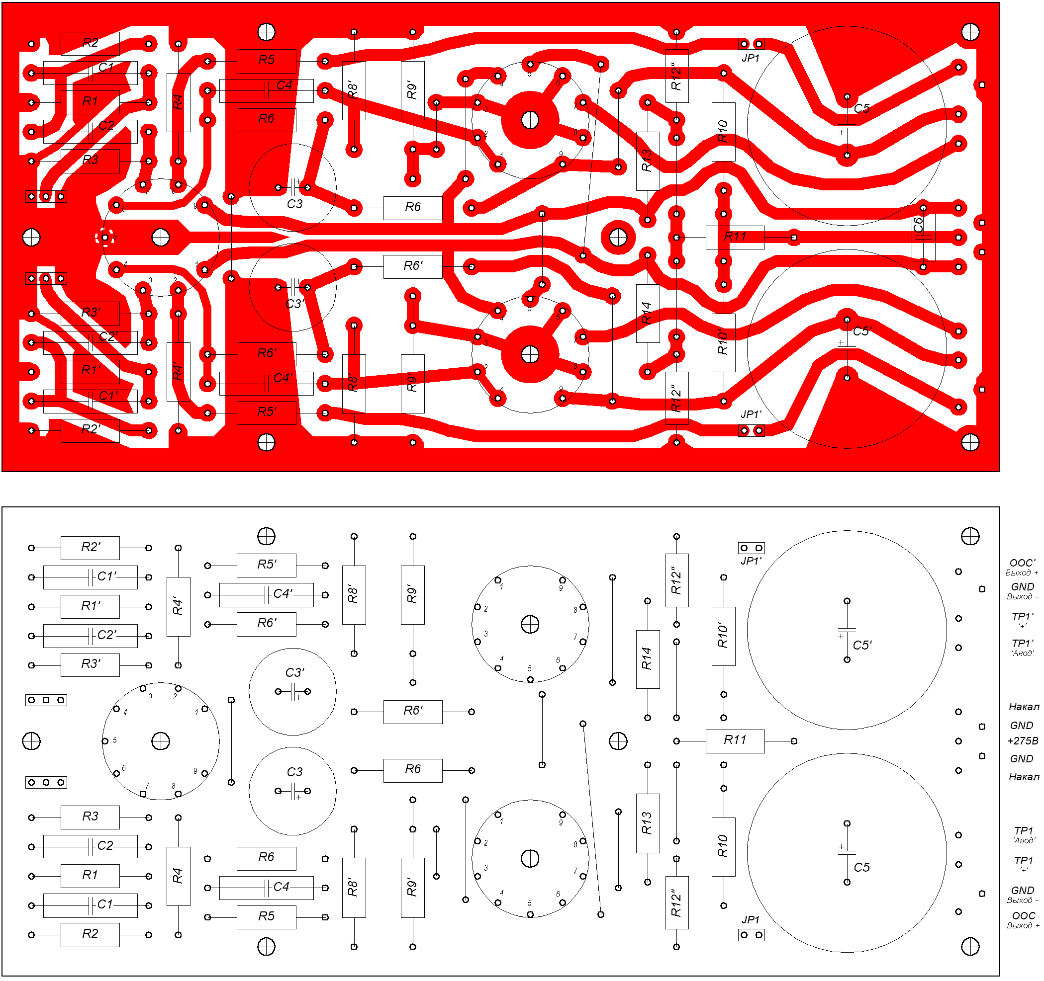 Для размещения ламп использованы панельки типа ПЛ9-2. Подойдут и другие панельки, которые можно устанавливать на печатную плату. При отсутствии таковых можно использовать панельки, не приспособленные для печатного монтажа. Для установки на плату к их выводам можно подпаять отрезки толстого одножильного провода, с помощью которых панелька и будет установлена на плате. Однако предпочтительнее будет доработать непосредственно выводы панельки, откусив острыми бокорезами (кусачками) часть вывода (см. фото). Джамперы JP1 использованы от вышедших из строя системных плат компьютеров. Такого же типа и штырьки разъема, через который сигнал подается на вход усилителя. Для подсоединения выходного трансформатора и блока питания на плате также смонтированы штырьки - они использовны от унифицированных разъемов, использовавшихся в телевизорах. Провода к этим штырькам подпаиваются, хотя не исключено и применение разъемов. При монтаже особое внимание следует уделить подсоединению к общему проводу - все цепи общего провода должны соединяться либо в одной точке, либо в строго определенной последовательности. На печатной плате такая последовательность соблюдена - необходимо лишь проследить, чтобы не было "лишних" соединений. Номинальная выходная мощность усилителя - 3 Вт, максимальная 4 Вт, номинальное входное напряжение 0,75 В. Этой мощности вполне достаточно для комфортного прослушивания аудиопрограмм в комнате площадью 30 м2 (используются акустические системы 6АС-224, из комплекта радиолы "Кантата-205"). Внешний вид смонтированного на плате усилителя показан на фотографии Налаживание усилителя несложно. Прежде всего убеждаются в работоспособности блока питания. Напряжение '+275' может быть в пределах от 250 до 300 В (в зависимости от типа использованного трансформатора). Переменное напряжение 6,3 В считается в пределах нормы, если оно не ниже 6,0 В, но и не выше 6,5 В. Затем к блоку питания подключают плату усилителя. Лампы пока не устанавливаем. Таблица 1 - напряжения на панельках без ламп