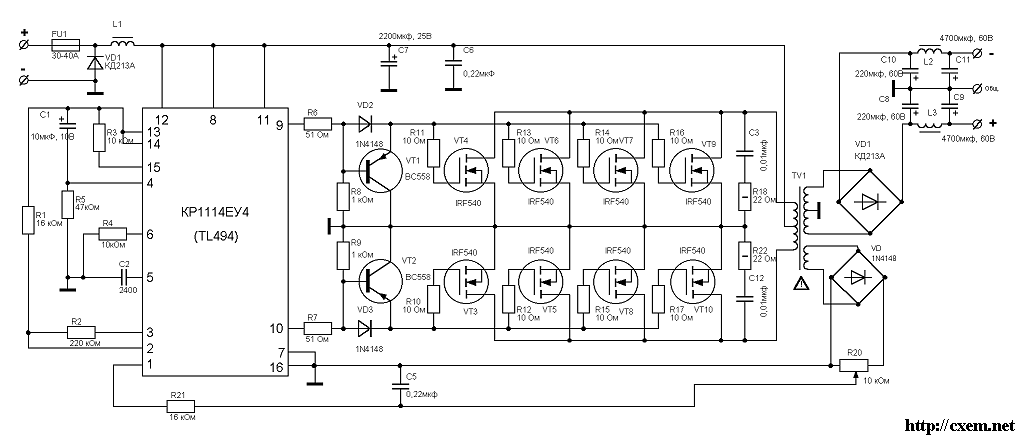 Немного о схеме: L1-намотан на 10-мм каркасе и содержит 18 витков провода ПЭЛ-1,2. Обе микросхемы посажены на радиатор из алюминиевого П-образного профиля 210Х11Х25 мм. Усилитель не требует никаких подстроек. Посмотрев на ее характеристики она мне подходила с "головой". При двух полярном питании 55 В, и нагрузке 8 Ом она выдавала мощность 150 Вт, а при 4 Омах 200 Вт (совсем недурно). И это только один канал, два канала 400 Вт при 4 Ом при коэффициенте гармоник не более 0,007% и полосе частот 20 Гц - 50 кГц. Это все хорошо но чем "кормить" такого "зверя", это нужен преобразователь как минимум на 400-450 Вт. Так как я не хотел слушать при таких мощностях 50 Гц "гул" в динамиках от преобразователя, решено было делать высокочастотный, заодно и размер по меньше. Сказано сделано, на микросхеме TL494 со стабилизацией выходного напряжения см. рис. 2
