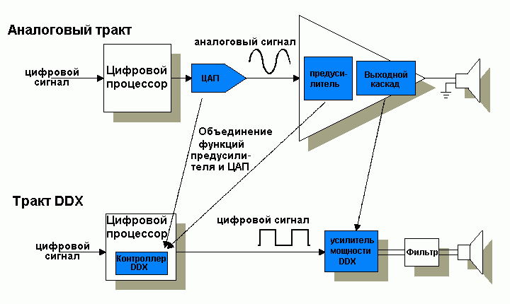 ЭНЦИКЛОПЕДИЯ РАДИОЭЛЕКТРОНИКИ И ЭЛЕКТРОТЕХНИКИ Что такое DDX (Direct Digital Amplification)? Энциклопедия радиоэлектроники и электротехники Энциклопедия радиоэлектроники и электротехники / Усилители мощности транзисторные Любая аудиосистема, определяемая сегодня как цифровая, на самом деле является цифро-аналоговой. Цифровой сигнал с носителя информации поступает на цифроаналоговый преобразователь (ЦАП, в англоязычной терминологии - DAC). В массовых аудиосистемах дальнейшая обработка сигнала (фильтрация, регулировка громкости, тембра и т.д.) производится аналоговыми методами. Это потенциальный источник искажений и шумов, особенно при обработке сигналов малого уровня. В аудиосистемах высокого класса обработка сигнала производится цифровым сигнальным процессором до ЦАП, что позволяет значительно уменьшить искажения. Однако эти различия в структуре не принципиальны - в любом случае сигнал после ЦАП поступает на аналоговый усилитель. Особенно уязвим звуковой сигнал на этапе аналоговой обработки и усиления, поэтому характер звучания так сильно зависит от примененных компонентов. Эта проблема в принципе решаема, вопрос только в цене. Не будем касаться проблем согласования компонентов и взаимодействия их между собой - ограничимся наиболее критичными звеньями. Это усилитель и ЦАП. Не вдаваясь в детали различных способов цифро-аналогового преобразования, отметим, что каждый из них придает звучанию свой оттенок. Усилители, как известно, тоже имеют свой собственный "почерк", определяемый классом работы выходного каскада и общей схемотехникой. Экономичные усилители класса AB или B вносят в сигнал значительные искажения, усилители класса A обеспечивают высокое качество звучания, но неэкономичны. Если же в тракте применяется цифровой усилитель, в нем проводится обратное преобразование входного аналогового сигнала в цифровую форму, что вносит дополнительные искажения. Поэтому цифровые усилители пока применяют в основном для сабвуферов, поскольку требования к качеству сигнала там не столь высоки. Чтобы улучшить качество звучания и сохранить высокую экономичность, звуковой тракт должен стать полностью цифровым - от носителя сигнала до акустической системы. Компания Apogee предложила для цифровых усилительных трактов технологию DDX (Direct Digital Amplification), в которой полностью исключены преобразование, обработка и усиление аналогового сигнала, что заметно упрощает и удешевляет систему. Цифровой сигнал после обработки в цифровом сигнальном процессоре поступает непосредственно на цифровой усилитель мощности, без дополнительных интерфейсов и преобразований (рис. 1). Процессор поддерживает передискретизацию вплоть до восьмикратной и может работать с частотами дискретизации до 96 кГц. Используется 24-битное представление сигнала, для систем передачи речи разработаны 8-битные устройства.
