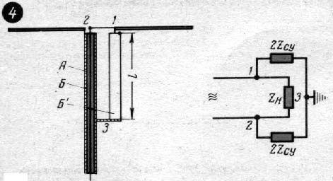 В этом устройстве входные зажимы 1-2 вибратора антенны непосредственно подключаются к внутреннему и внешнему проводникам коаксиального кабеля, который размещен внутри металлического стакана В по его оси так, что стенки стакана и экранирующая оболочка Б кабеля образуют коаксиальную линию с волновым сопротивлением r (формулы для расчета волновых сопротивлений коаксиальных и двухпроводных линий приведены в журнале "Радио" N 11 за 1962 г.). Входное сопротивление этой линии между точками 2 и 3 равно: При l=l/4 величина Z2,3 велика, ток от точки 2 к точке 3 не потечет, и токи на обеих сторонах антенны будут равны. Если же длина l стакана В будет отлична от l/4, то Z2,3 не будет велико и, как это видно из эквивалентной схемы рис. 2,б, симметрия нарушится: в точке 2 часть тока будет ответвляться на землю и напряжения между землей и точками 1-2 уже не будут равны и противофазны. Поэтому рабочая полоса частот такого симметрирующего устройства невелика. Обычно она не превышает 10% от значения основной частоты, на которую спроектировано устройство.