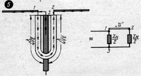 Схема симметрирующего устройства типа "U-колено" показана на рис.5,а. Здесь центральный провод основного коаксиального фидера присоединяется к зажиму 1 левой половины вибратора. От этой же точки напряжение к зажиму 2 правой половины вибратора подается через отрезок кабеля длиной l/2, где l - длина волны в кабеле (с учетом укорочения). Фаза напряжения при прохождении участка кабеля длиной l/2 сдвигается на 180°, поэтому к зажимам вибратора подводится требуемое противофазное напряжение. Экранирующие оболочки кабелей соединены между собой.