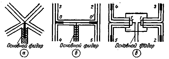 Например, в схеме рис. 2,а удобно применить линии с wрасп.фид.=300 ом при wосн.фид.=75 ом так как, будучи включенными параллельно, эти линии обеспечат в основном питающем фидере такое же значение КБВ, которое имеет место в каждом из распределительных фидеров.