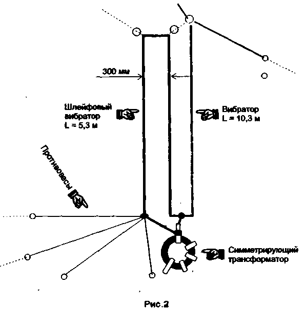 ЭНЦИКЛОПЕДИЯ РАДИОЭЛЕКТРОНИКИ И ЭЛЕКТРОТЕХНИКИ Модернизация антенны Ротхаммеля. Энциклопедия радиоэлектроники и электротехники Энциклопедия радиоэлектроники и электротехники / Антенны КВ За основу взята конструкция вертикальной антенны из книги К.Ротхаммеля, но вместо вертикального полуволнового вибратора с целью повышения волнового сопротивления используется шлейфовый излучатель с системой противовесов, расположенных под углом 120 градусов. Четыре пассивных элемента антенны согнуты под таким же углом. В середине каждого пассивного элемента установлены реле, рис.1. Известно, что максимум излучения антенны приходится на место, где имеется максимум тока. Если высота установки (подвеса) антенны меньше 1/4 лямбда, то лучше использовать вертикальное расположение излучателя (вертикальная поляризация). Конструируя эту антенну, исходил из следующей предпосылки. Проживая в панельном 5-ти этажном доме, крыша которого общедоступна по определению, как-то не хотелось использовать достаточно дорогие материалы и узлы - очень рискованно - упрут. Поэтому появилось желание минимизировать затраты на ее изготовление. Предлагаемая антенна для 20-ти метрового диапазона не содержит дефицитных материалов и занимает площадь 10 на 10 метров, работает, на мой взгляд, нс хуже двойного квадрата, а время переключения диаграммы излучения занимает всего одну секунду. Основой конструкции является металлическая (стальная) труба диаметром 25 мм и высотой 9 метров с металлической крестовиной на верху. Длина каждой перекладины 2,6 метра (по 1,3 м в каждую сторону). Ниже на расстоянии 5,5 м устанавливается изоляционная пластина, на которой крепятся противовесы и шлейфовый вибратор, растянутый параллельно трубе-мачте. Расстояние между активным и пассивными элементами вверху и внизу некритично и выбирается 1 ... 1,5 м. Расстояние от точки питания до реле равно 3 м и определяется длиной оттяжки между реле и изоляционной пластиной. Крестовина приваривается на 0,5 м ниже верхнего конца трубы и расчаливается стальной проволокой. Нижние концы пассивных элементов и противовесов через короткие оттяжки закрепляются на крыше и как-бы усиливают антенну, поэтому вполне достаточно одного яруса оттяжек, идущих от 1/3 трубы сверху. Длина шлейфового виб-ратора около 5,3 м, а расстояние между его проводами 30 см. Длина противовесов 5,3 м, рис.2. Длина пассивного элемента как директора - Юм, контакты реле замыкают удлиняющий шлейф. Длина пассивного элемента как рефлектора - 11м, контакты реле разомкнуты. Проволочный шлейф длиной 1 м подвешен на оттяжке, идущей от реле. Переключающие реле типа РЭС-9, обе группы контактов соединены параллельно. Параллельно обмоткам реле установлены конденсаторы 0,01 мкФ, рис.3. Излучение антенны (диаграмма направленности) переключается двумя тумблерами с нейтральным положением. Один переключает направление восток -запад, другой север - юг. Каждая позиция тумблера подключает соответствующее реле. Возможны 8 (восемь) рабочих комбинаций:, 4 позиции - один директор три рефлектора и 4 позиции - два директора дав рефлектора, что соответствует выбору следующих направлений: Север, Север-Восток, Восток, Юго-Восток, Юг, Юго-Запад, Запад, Северо-Запад. Питание антенны осуществляется коаксиальным кабелем 50 Ом. Для симметрирования и уменьшения шумов при приеме этим же кабел