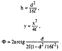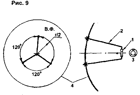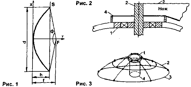 ЭНЦИКЛОПЕДИЯ РАДИОЭЛЕКТРОНИКИ И ЭЛЕКТРОТЕХНИКИ Параболические антенны для СТВ. Энциклопедия радиоэлектроники и электротехники Энциклопедия радиоэлектроники и электротехники / Антенны телевизионные Заинтересовавшись приемом СТВ, радиолюбители, как правило, приобретают для этого готовый комплект аппаратуры. В него обычно входит параболическая антенна (ПА) небольшого диаметра (0,9...1,2 м). Одним из первых шагов модернизации системы является приобретение антенны большего диаметра. Но антенны большого диаметра очень дороги, поэтому многие пытаются изготовить ПА в домашних условиях. В радиолюбительской литературе публиковались статьи об изготовлении ПА, например [1], но в них не учитывались некоторые факторы. Дело в том, что при конструировании антенн нужно учитывать параметры облучателя, входящего в состав конвертера. Данная статья направлена на систематизацию данных по конструированию ПА и применение их к имеющимся условиям. Существует множество видов СВЧ-антенн - параболические, фазированные решетки, на основе линз Френеля и т.д. Применительно к условиям домашнего изготовления рекомендуются ПА, ввиду простоты их изготовления. Возможны два варианта исполнения ПА: - путем выклейки на матрице; - пайкой из медной проволоки и сетки (т.н. сетчатые антенны). Каждая из антенн имеет свои достоинства и недостатки. К достоинствам первой относится простота контроля формы при изготовлении, ко второй - меньшие масса и парусность. Прежде всего нужно определить, какой облучатель имеется в наличии у радиолюбителя. Обратимся к рис.1 и определим, какие параметры характеризуют антенну. Во-первых, это ее диаметр d (как правило, им и задаются в начале расчета). Наикратчайшее расстояние от фокуса антенны (в фокусе располагается облучатель конвертера, либо второе зеркало в случае двухрефлекторной системы) до .рефлектора антенны называется фокусным расстоянием f. Глубина зеркала h - наибольшее расстояние от плоскости раскрыва рефлектора S до самого рефлектора антенны. Угол апертуры Ф - угол, под которым видна плоскость раскрыва зеркала антенны S из ее фокуса F. При этом они связаны следующими соотношениями. Отношение f/d определяет параметры вашего облучателя. Обычно f/d лежит в пределах 0,3...0,5. Чем больше это отношение, тем меньше h и тем меньше расход материалов на изготовление ПА (при некоторой потере коэффициента усиления Ку). Если вы имеете облучатель с f/d=0,3 и хотите снизить расходы, то приобретите облучатель с f/d=0,5, а лучше всего приобрести облучатель с изменяемым f/d. Сначала по формуле (2) вычисляют зависимость у от х (принимающего значения от 0 до d/2) и составляют таблицу. Получившиеся значения переносят на миллиметровку и строят параболу. Далее ее наклеивают на лист стали толщиной 5 мм и выпиливают по линии параболы. Таким образом получается нож (необходимо строго соблюдать его форму, т.к. от этого в большой мере зависит конечный результат и качество ПА). Затем, в соответствии с рис.2, следует подобрать стержень 2 и подшипник 1 подходящих размеров (3 - нож). При этом нож укорачивают на половину диаметра стержня 2 и приваривают к нему соосно. В соответствии с рис.3 изготавливают каркас из стального прутка диаметром 8...10 мм (сваркой). При этом ребра 2 приблизительно выгибают по ножу. В вершину каркаса вваривают подшипник. Устанавливают каркас на ровной площадк