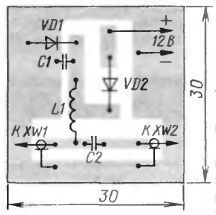 Конструкция отдельного развязывающего устройства аналогична разветвителю. Все детали монтируют на печатной плате из двусторонне фольгированного стеклотекстолита по рис. 5. Дроссель L1 - ЕС24 индуктивностью 1...10мкГн. Его можно изготовить самостоятельно, намотав на оправке диаметром 2,5...3 мм 10-15 витков провода ПЭВ-2 0,2.