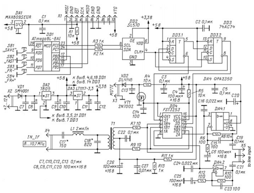 Устройство представляет собой приемник прямого преобразования на фиксированную частоту и очень близко по схемотехническим решениям "SoftRock 6.2". Этот вариант имеет отличные динамические параметры и очень хорошее соотношение простота/цена/качество. Основное отличие от оригинального "SoftRock" - это применение вместо кварцевого генератора синтезатора частоты на микросхеме Si570 CAC000141G (DD2). Такое решение позволяет настроить панорамную приставку на частоту приема сигнала первой ПЧ любого трансивера, и необходимость в поиске нужного кварцевого резонатора отпадает. Это не дешевое решение (микросхема Si570 стоит примерно 30...40 долл. США), но наиболее качественное и простое схемотехнически. С таким синтезатором можно принимать сигналы от 1 до 80 МГц и даже выше. Микросхема Si570 (КМОП версии) способна генерировать сигнал с максимальной частотой до 160 МГц, но максимальная частота приема будет ограничена быстродействием примененных в смесителе аналоговых ключей - микросхемы FST3253 (DD4). Реально проверена работа приставки на частоте ПЧ трансивера ICOM - 70,4515 МГц. Схему приемника можно выбрать в одном из двух вариантов. Приемная часть и синтезатор одинаковы для обеих версий панорамной приставки, отличие только в фазовращателях. Какой вариант выбрать - решать вам. Печатная плата также разработана для двух вариантов. Первый вариант - с применением фазовращателя на делителе на четыре, т. е. самый распространенный, обеспечивающий в нашем случае максимальную частоту приема 40 МГц (160 МГц/4) и не требующий настройки фазовращателя. Этот вариант удобен для трансиверов с низкой ПЧ.