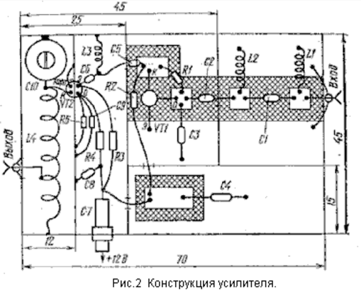 Усилитель имеет два каскада усиления, собранные на транзисторах VT1 и VT2 (рис. 1), включенных по схеме с общим эмиттером и схеме с общей базой соответственно. Такое каскодное включение транзисторов VT1 и VT2 обусловлено стремлением снизить коэффициент шума усилителя в целом. Перестройку усилителя по частоте осуществляют посредством плавной регулировки подстроечным конденсатором С10 во втором каскаде усиления, АЧХ которого имеет форму колоколообразного пика с максимумом усиления в узком диапазоне шириной около 8 МГц. Входной контур L1C1L2C2 является фильтром верхних частот с частотой среза около 48,5 МГц для первого поддиапазона и около 160 МГц - для второго. Режим работы транзистора VT1 по постоянному току задан резисторами R1 и R2 таким образом, чтобы получить напряжение на его коллекторе равным +5 В при токе коллектора около 5 мА. В таком режиме коэффициент шума транзистора серии КТ371А составляет 3,4...4,7 дБ на частоте 400 МГц [2], а на частотах ниже 400 МГц шум транзистора будет меньше. Емкость конденсатора С3 вместе с входной емкостью транзистора VT1 ограничивают усиление первого каскада на высшей частоте поддиапазона. Измеренный коэффициент усиления первого каскада составляет 13...15 дБ в обоих поддиапазонах. Элементы С5, L3, С6 представляют собой входной фильтр верхних частот второго каскада и служат для подавления сигналов нижних частот. Транзистор VT2, в коллекторную цепь которого включен контур L4C10, является резонансным усилителем. Параметры элементов контура L4C10 определяют узкую АЧХ второго каскада, а их изменение обеспечивает возможность перестройки АЧХ в широком диапазоне частот. Использование в качестве VT2 транзистора серии ГТ346А, включенного по схеме с общей базой, обусловлено тем, что в этой схеме включения транзистор имеет малую проходную емкость. Резисторы R3 - R5 обеспечивают следующий режим транзистора VT2 по постоянному току: напряжение коллектора 10 В, ток эмиттера - около 1 мА. При этом коэффициент шума транзистора ГТ346А не превышает 4 дБ [2]. Коэффициент усиления второго каскада равен 12... 14 дБ при полосе пропускания 8 МГц. Конденсаторы С4, С8 необходимы для сглаживания пульсации питающего напряжения и предотвращения самовозбуждения усилителя. Рациональный монтаж и оптимизированная конструкция обеспечивают надежную и устойчивую работу усилителя при высоком коэффициенте усиления (рис. 2). Изменение коэффициента усиления по диапазону в пределах каждого из поддиапазонов, вызванное неравномерностью АЧХ, не превышает 3 дБ. Таким образом, при перестройке усилителя на различные каналы в пределах одного поддиапазона значения коэффициента усиления отличаются не более чем на 3 дБ; при этом коэффициент усиления в первом поддиапазоне на 2...3 дБ выше, чем во втором. Вместо транзистора КТ371А в усилителе могут быть применены транзисторы серий КТ382А, КТ382Б, КТ367А, а вместо транзистора ГТ346А можно использовать ГТ346Б, но в случае использования последнего возрастает уровень собственных шумов усилителя. Вместе с тем уровень собственных шумов можно уменьшить, применив вместо транзистора КТ371А транзисторы КТ372, КТ3101, КТ3115, КТ3132 с любым буквенным индексом. В таком случае сопротивление резистора R1 должно быть уменьшено до 100 кОм, а сопротивление резистора R2 должно быть увеличено до 3,2 кОм для обеспечения напряжения на коллекторе транзистора VT1 равным 5 В при ток