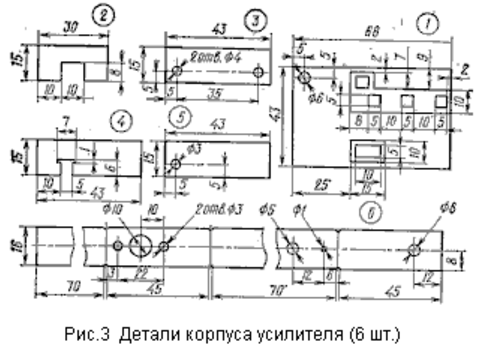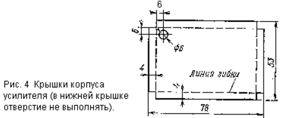 В усилителе использованы конденсаторы С4, С8 типа КМ-5, остальные КД-1, КД-2. Проходной конденсатор С7 - К.10-51; подстроечный конденсатор С10 - КТ4-23. Все резисторы в усилителе - МЛТ-0,125. Усилитель собран в металлическом прямоугольном корпусе с размерами 70х45х15 мм. Корпус сверху и снизу закрыт легкосъемными крышками, которые после окончательной настройки припаивают к корпусу. Детали конструкции усилителя выполнены из луженой меди толщиной 0,5 мм; может быть использована также листовая латунь или жесть (рис. 3, 4). Основой усилителя является печатная плата 1, выполненная из одностороннего фольгированного стеклотекстолита толщиной 1,5 мм, к которой припаяны остальные детали конструкции. В случае использования двустороннего стеклотекстолита фольга с обратной стороны платы удаляется. Фольгу с участков платы, обозначенных на рисунке штриховыми линиями, необходимо перед сборкой удалить. Удаление фольги может быть осуществлено как механическим путем, так и травлением. На рис. 2 показано размещение в корпусе элементов усилителя, которые следует устанавливать на место только после окончательной сборки корпуса. Для обеспечения минимальной паразитной емкости монтажа элементы в корпусе устанавливают, максимально укорачивая длину их выводов; при пайке элементов необходимо использовать теплоотвод. Вход усилителя припаивают к антенному гнезду, которое при помощи двух винтов с гайками крепится к боковой стенке корпуса (деталь 6 на рис. 3). К выходу усилителя припаивают снабженный унифицированным антенным штекером отрезок телевизионного кабеля с волновым сопротивлением 75 Ом длиной 0,7...1 м, при помощи которого соединяют выход усилителя с антенным входом телевизионного приемника. Настройка усилителя при правильном монтаже и использовании заведомо исправных деталей сводится к проверке режимов транзисторов VT1 и VT2 по постоянному току. Отклонение напряжений на выводах транзисторов от указанных на схеме (см. рис. 1) не должно превышать ± 5 %. С помощью конденсатора С 10 настраивают усилитель на один из телевизионных каналов метрового диапазона по максимальной контрастности и устойчивости изображения на экране телевизионного приемника. Затем растягиванием и сжатием витков катушек L1, L2 (для фильтра верхних частот первого каскада) и катушек L3, L4 (для фильтра верхних частот второго каскада) добиваются наиболее качественного изображения, подстраивая таким образом частоты среза фильтров верхних частот. При этом компенсируется возможный вследствие разброса параметров элементов и емкостей монтажа уход частоты среза обоих фильтров верхних частот. Окончательную настройку плавной подстройкой конденсатора С10 желательно проводить в собранном усилителе е припаянными верхней и нижней крышками При помощи контурной отвертки, выполненной из диэлектрического материала. Усилитель, как правило, располагается в непосредственной близости от телевизионного приемника. В случае, если длина телевизионного кабеля снижения превышает 15...20 м, для улучшения соотношения сигнал/ шум на входе телеприемника усилитель целесообразно расположить вблизи приемной антенны, приняв меры по его влаго- и теплоизоляции. При размещении усилителя на мачте наружной антенны для исключения вредного влияния на него атмосферы крышки корпуса, должны быть тщательно припаяны к корпусу по 