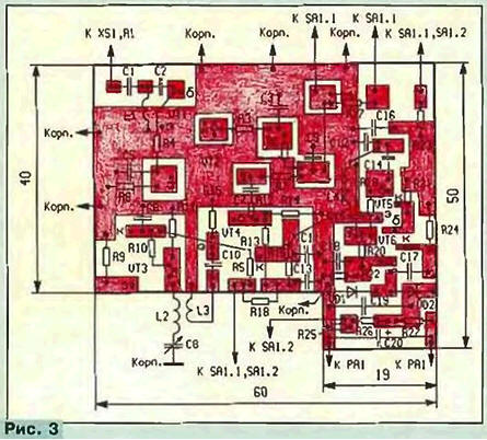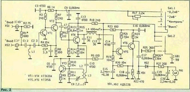 ЭНЦИКЛОПЕДИЯ РАДИОЭЛЕКТРОНИКИ И ЭЛЕКТРОТЕХНИКИ Прибор для ориентировки антенн ДМВ. Энциклопедия радиоэлектроники и электротехники Энциклопедия радиоэлектроники и электротехники / Антенны телевизионные С трудностями при ориентировке антенн сталкиваются многие радиолюбители. Облегчить этот процесс могут специальные приборы - перестраиваемые индикаторы или измерители уровня. В частности, в "Радио" № 11 за 1996 г. (с. 8, 9) был описан прибор для ориентировки антенн в диапазоне MB. В публикуемой здесь статье рассмотрено аналогичное устройство для диапазона ДМВ. Развитие сети эфирного телевизионного вещания в нашей стране идет по пути ввода в действие новых передатчиков, работающих в основном в диапазоне ДМВ. Очень часто бывает непросто добиться высококачественного приема телепрограмм в этом диапазоне. Большинство новых передатчиков, как правило, имеют небольшую мощность, низкую высоту установки передающих антенн, нередко расположенных в разных городских районах. Все это приводит к тому, что применение комнатных антенн становится невозможным. Приходится использовать эффективно направленные антенны, размещать их вне жилого помещения и на значительном удалении от телевизора. В свою очередь, это вызывает дополнительное затухание сигнала в соединительном кабеле, что вынуждает применять антенные усилители. Кроме того, возникает проблема ориентировки антенн. В решении указанных проблем поможет предлагаемый для повторения радиолюбителями относительно несложный прибор. Он позволяет значительно упростить процедуру ориентировки и приближенно определить уровень принимаемого телевизионного сигнала. Его габариты невелики (см. рис. 1, примерно как пачка сигарет), поэтому им удобно пользоваться при ориентировке антенн в самых различных местах. Прибор разработан по просьбам читателей на основе схемотехники аналогичного устройства для диапазона MB, описанного в "Радио" ранее. Схема его проще (см. рис. 2), а габариты - меньше. Прибор представляет собой приемник прямого преобразования сигналов диапазона ДМВ и содержит усилитель ВЧ (VT1, VT2), гетеродин (VT3), смеситель (VT4), видеоусилитель (VT5, VT6) и амплитудный детектор (VD1, VD2). Уровень принимаемого сигнала индицируется стрелочной измерительной головкой РА1. Телевизионный радиосигнал поступает на усилитель ВЧ, собранный по двухкаскадной схеме с глубокой отрицательной обратной связью по постоянному току через резистор R4. На входе усилителя ВЧ установлен фильтр ВЧ C1L1C2, который подавляет сигналы, лежащие ниже диапазона ДМВ. Для расширения интервала индикации уровня принимаемых сигналов на входе установлено два ВЧ разъема. Через разъем XS1 радиосигнал с антенны поступает на фильтр ВЧ. Подав тот же сигнал на разъем XS2, можно ослабить его в десять раз. Коэффициент передачи усилителя ВЧ равен примерно 15 дБ, а неравномерность АЧХ в интервале частот 470...800 МГц не превышает 1 дБ. Усиленный сигнал приходит на смеситель. Туда же подан сигнал гетеродина. Результирующий видеосигнал через фильтр НЧ С11L4C12 с частотой среза 4 МГц проходит на видеоусилитель. Гетеродин собран по схеме емкостной трехточки. Его частоту перестраивают конденсатором переменной емкости С8. Со смесителем гетеродин связан через катушку связи L3. Он работает в интервале ДМ В. Полоса преобразованных частот равна от 0,02 до4 МГц. Поскольку в пр