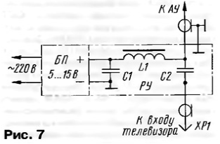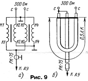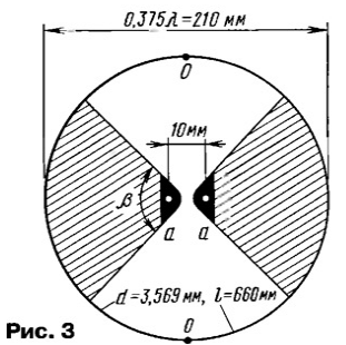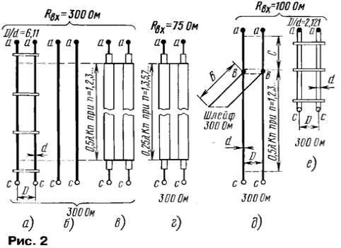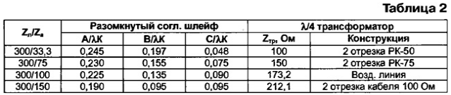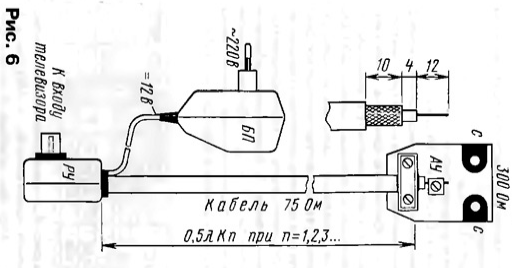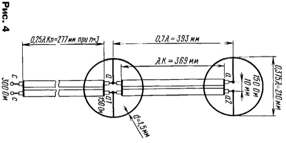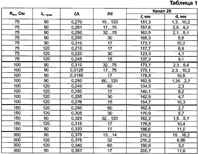 ЭНЦИКЛОПЕДИЯ РАДИОЭЛЕКТРОНИКИ И ЭЛЕКТРОТЕХНИКИ Зигзагообразные активные антенны ДМВ. Энциклопедия радиоэлектроники и электротехники Энциклопедия радиоэлектроники и электротехники / Антенны телевизионные Для приема телевизионных сигналов в диапазоне ДМВ, особенно в неблагоприятных условиях, необходимо использовать хорошие антенны с антенными усилителями, т. е. активные антенны. Об опыте постройки таких антенн и рассказывает автор публикуемой статьи. В диапазоне ДМВ применение эффективных антенно-фидерных систем (АФС) для приема сигналов в сложных условиях не потеряло своей актуальности. Относительно малая длина λ этих волн позволяет создавать высокоэффективные антенны при сравнительно небольших размерах. После длительных экспериментов с разными антеннами за основу была взята известная зигзагообразная антенна [1], показанная на рис. 1. Конструктивно в классическом виде полотно антенны состоит из двух одинаковых ромбовидных частей, повернутых одна относительно другой на 180°. Следовательно, такая антенна симметрична. Эта особенность допускает применение антенных усилителей (АУ) с симметричным входом и большим усилением, например, пластинчатых усилителей (ПАУ) SWA и др. [2, 3]. Усиление зигзагообразной антенны зависит от отношения l/λ, а ее входное сопротивление - от отношений l/d и l/λ. Максимальное усиление достигается при длине l = 0,375λ, но при этом оно сильно зависит от диаметра провода. При l = 0,25λ усиление получается, конечно, меньше, но и зависимость от диаметра провода уменьшается. При изменении угла α изменяются габариты полотна. Так, если α = 90°, то SH = 2√2l = 2,83l; SE = l√2= 1,41l, а если α = 120°, то SH = 2l; SE = 1,73l. Это необходимо учитывать при создании сложных АФС (об этом дальше). Основные размеры полотна антенны, например, для 29-го канала сведены в табл. 1. Следует также иметь в виду и то, что с уменьшением диаметра провода и увеличением периметра полотна усиление растет. Кроме того, при выборе более тонкого провода уменьшается парусность антенны. Различные конструктивные исполнения антенны имеют разные входные сопротивления (табл. 1). Следовательно, необходимы и разные способы согласования симметричного входа полотна с симметричным входом АУ, имеющим входное сопротивление 300 Ом. Они показаны на рис. 2 [4]. При входном сопротивлении полотна 300 Ом АУ, конечно, можно подключить непосредственно к точкам а - а. Однако для увеличения усиления и направленного действия антенны полотно обычно используют вместе с рефлектором (о нем будет рассказано ниже). Поэтому АУ лучше установить за рефлектором, соединив с полотном симметричной линией с волновым сопротивлением 300 Ом так, как показано на рис. 2,а - для воздушной линии, на рис. 2,6 - для кабеля КАТВ или на рис. 2,в - для кабеля РК-150. В последнем случае оплетки двух отрезков кабеля спаивают одну с другой на концах. Во всех случаях необходимо учитывать коэффициент укорочения линии К. Для воздушной линии из проводов (рис. 2,а) - К=0,975, для КАТВ (рис. 2,6) - К = 0,8, для кабеля РК-150 (рис. 2,в) - К = 0,75...0,86 в зависимости от типа кабеля. Наиболее удобно (по мнению автора) использовать полотно с входным сопротивлением 75 Ом. В этом случае для согласования можно применить четвертьволновый согласующий трансформатор из линии с волновым сопротивлением 150 Ом так, как изображено на рис. 2, г. Он образован двумя отрезками кабеля РК-75 длино
