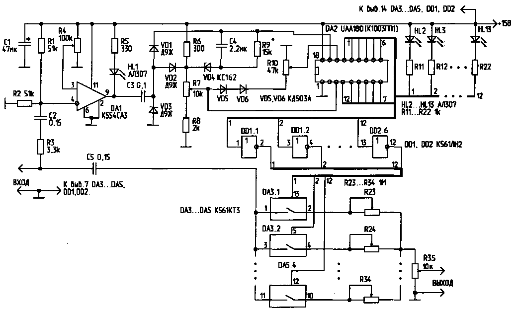 Энциклопедия радиоэлектроники и электротехники / Аудиотехника Для регулировки амплитудно-частотной характеристики усилителей обычно используют многополосные активные или пассивные RC- или LC-фильтры. Такие устройства содержат большое количество элементов, требующих индивидуальной регулировки, и не могут быть использованы в компактной аппаратуре. Схема простого бесфильтрового эквалайзера, имеющего 12 частотных каналов, приведена на рисунке. Формирователь прямоугольных управляющих импульсов выполнен на компараторе DA1. С выхода компаратора сигнал поступает на преобразователь "частота/напряжение", выполненный на основе элементов С3, С4, VD1, VD2, R9. Сигнал, напряжение которого пропорционально частоте входного сигнала, поступает на вход управления линейной светодиодной шкалой (вывод 17) микросхемы DA2. Сигналы, снимаемые с микросхемы DA2, через инверторы DD1, DD2 управляют включением 12 аналоговых ключей, выполненных на микросхемах DA3...DA5. Выходной сигнал эквалайзера формируется суммированием аналоговых сигналов по всем 12 каналам с раздельным регулированием частотных составляющих потенциометрами R23...R34.