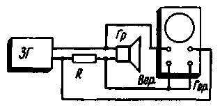 Ñõåìà âêëþ÷åíèÿ çâóêîâîé êàòóøêè ëþáîãî ãðîìêîãîâîðèòåëÿ äëÿ èçìåðåíèÿ ñäâèãà ôàç ïîêàçàíà íà ðèñ.2. Âûâîäû ãðîìêîãîâîðèòåëÿ Ãð ïîäêëþ÷àþòñÿ ê âûõîäó äîñòàòî÷íî ìîùíîãî (íå ìåíåå 2-3 Âò) çâóêîâîãî ãåíåðàòîðà Çà ÷åðåç àêòèâíîå ñîïðîòèâëåíèå R, íàïðÿæåíèå ñ êîòîðîãî ïîäàåòñÿ íà ïëàñòèíû ãîðèçîíòàëüíîãî îòêëîíåíèÿ. Íàïðÿæåíèå íåïîñðåäñòâåííî ñî çâóêîâîé êàòóøêè ïîäàåòñÿ íà ïëàñòèíû âåðòèêàëüíîãî îòêëîíåíèÿ. Ïðè òàêîì âêëþ÷åíèè îáåñïå÷èâàåòñÿ âîçìîæíîñòü íàáëþäåíèÿ ôàçîâîãî ñäâèãà ìåæäó òîêîì è íàïðÿæåíèåì â öåïè çâóêîâîé êàòóøêè è ìîæíî ôèêñèðîâàòü ìîìåíò ðåçîíàíñà. Ïðè ýòîì âíóòðåííÿÿ ãîðèçîíòàëüíàÿ ðàçâåðòêà â îñöèëëîãðàôå äîëæíà îòêëþ÷àòüñÿ.