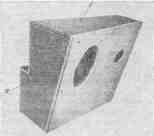 При прослушивании звучание угловых агрегатов с ПАС и ватой было признано наиболее приятным. Особенно хорошо звучали агрегаты с громкоговорителем 6ГД-1 и "пищалкой". Изготовить угловой акустический агрегат практически не сложнее, чем обычный ящик с закрытой задней стенкой. С точки зрения отделки (наклеивание шпона, полировка) угловой агрегат имеет преимущество перед обычным ящиком, поскольку помимо задней не нуждаются в отделке и две его боковые стенки (рис. 1 стенки "а" и "б"). Конструктивный чертеж левого агрегата и его размеры приведены на рис. 5. Правый агрегат должен иметь наклон фронтальной доски в другую сторону, являясь зеркальным отображением левого. Вырезанные из фанеры или древесно-стружечной плиты детали ящиков скрепляются между собой плотно, без щелей, при помощи реек, клея и шурупов. Фронтальная доска съемная и привинчивается к ящику при помощи винтов и стальных уголков с резьбой, устанавливаемых на боковых стенках. Для более плотного прилегания между фронтальной доской и ящиком помещена полоска фетра. Конечно, при сборке ящика вместо фронтальной доски съемной можно сделать его заднюю крышку.