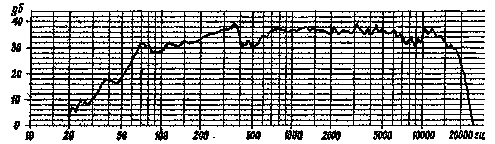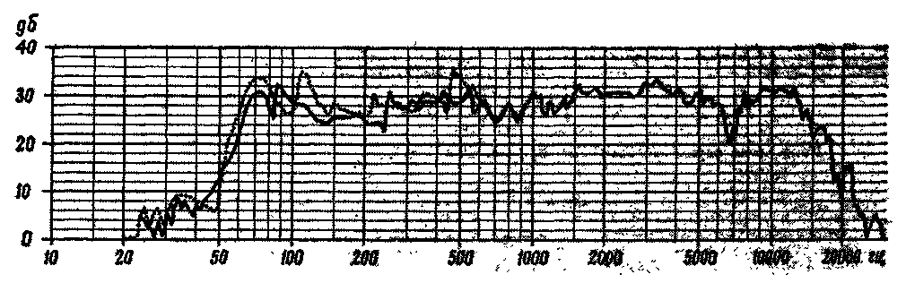На рис.3 приведены частотные характеристики громкоговорителя 4ГД-28 при установке его в предлагаемом угловом агрегате (сплошная линия) и в прямоугольном ящике одинакового с ним объема (пунктирная линия). Оба ящика пустые. Все частотные характеристики измерялись в условиях, эквивалентных свободному пространству.