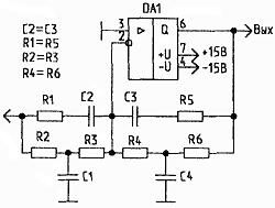 Он представляет собой режекторный фильтр с частотой настройки f0: f0=1 / 2πRC . Глубина режекции (подавления частоты f0) такого фильтра при работе на высокоомную нагрузку достигает 50 дБ. Неполный двойной Т-мост (рис.2б) имеет ту же частоту настройки, однако добротность фильтра гораздо ниже, и глубина режекции - всего 10 дБ.