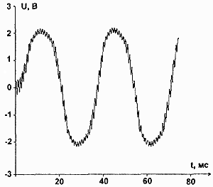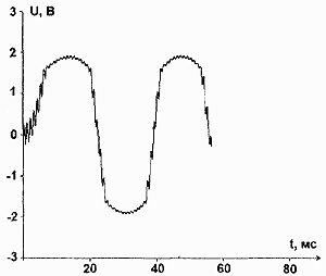 На осциллограмме рис.14 по сравнению с рис.13 заметно значительно меньшее подавление сигнала частотой 1 кГц, однако уже появляются фазовые искажения. Поэтому приходится искать компромисс между степенью сохранения СЧ- и ВЧ-составляющих сигнала и дополнительными фазовыми искажениями. Печатная плата устройства размерами 55x75 мм показана на рис.15, а сборочный чертеж - на рис.16.