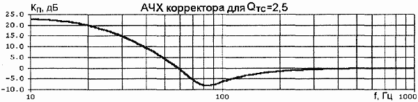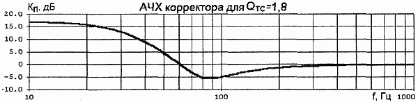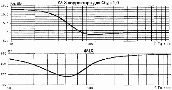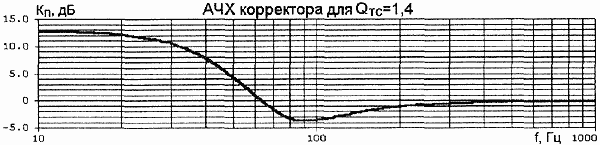 были равны. Коэффициент усиления в области НЧ определяется отношением Kнч = R4/R2. В зависимости от добротности НЧ-головки в акустическом оформлении, значение Kнч меняется в пределах 4,5...15. Очевидно, что при использовании корректора, УМЗЧ должен иметь соответствующий запас по перегрузке. От резисторов R1 и R5 зависит добротность Т-мостов. Параметры элементов корректора для некоторых значений добротности головки в акустической системе с фазоинвертором (ФИ) приведены в табл.1.