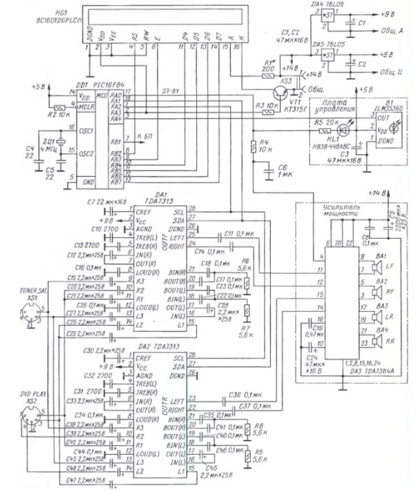 В этой конструкции управление осуществляется с пульта ДУ DVD плейера, используя кнопки управления телевизором (см. фото на рис. 1). От "старых добрых времен" у многих остались различные колонки и динамические головки, которые и выбросить жалко, и применить некуда. Популярные в свое время AC 35AC-01 или их модификации с успехом можно применить в качестве фронтальных. В этом случае сабвуфер становится ненужным, а в качестве центрального громкоговорителя с успехом можно использовать АС телевизора, тем более что ПДУ есть у всех современных телевизоров. Нелишне заметить, что качество дисков на рынке оставляет желать лучшего. Мне попадались диски формата 5.1 (особенно с переводом на русский язык), при воспроизведении которых звук центрального канала приходилось вообще выключать. При исключении центрального канала и сабвуфера (в настройках воспроизведения DVD) звуковая информация распределяется между фронтальными каналами. Известно, что из-за особенностей строения слухового аппарата человека локализация звуковых образов в стерео-панораме происходит в среднечастотном диапазоне. Поэтому в качестве тыловых можно использовать практически любые широкополосные динамические головки в акустическом оформлении. Замечено, что хотя оба источника звука (TV тюнер и DVD плейер) - цифровые с аналоговыми выходами, тембр у них все-таки разный, поэтому настройки тембра было решено сделать для каждого источника звука независимыми. В формате 5.1 номинальные уровни звука во фронтальных и тыловых каналах должны быть примерно одинаковыми. В формате же 2.0 тыловые каналы используются в качестве "подсветки", поэтому уровень в этих каналах должен быть понижен. Регулировки баланса также должны быть независимыми от режима работы. Во многих местностях, особенно в глубинке, качество электросети пока еще оставляет желать лучшего. Внезапное отключение и еще более внезапное включение света, перекос фаз, протекание потолка и т. п. происшествия наводят на мысль, что оставлять электроприборы постоянно включенными в сеть нецелесообразно. Хотя многие уже привыкли к тому, что подобные устройства постоянно готовы к употреблению, т. е. находятся в дежурном режиме. Поэтому было принято решение, помимо дежурного режима, иметь возможность полного отключения ДК от сети. А специально для забывчивых введен отключаемый таймер питания. Кроме того, при нахождении устройства в дежурном режиме свыше 5 мин при выключенном таймере на экран дисплея периодически выводится уведомление о том, что таймер выключен и, следовательно, устройство необходимо выключить принудительно. Управление ДК должно быть максимально простым, а индикация дисплея - информативной и интуитивно понятной. Поэтому решено оперативно управлять переключением рабочего и дежурного режимов, регулировкой общей громкости, выбором источника звука и его режимом. Остальные регулировки можно вызывать через меню. Детали должны быть доступны и дешевы; наконец, самодельная конструкция - это всегда собственный выбор и предпочтения, что немалого стоит для радиолюбителя. Все это реализовано в предлагаемой конструкции. Схема устройства Принципиальная схема устройства показана на рис. 2. Включение всех микросхем и модулей - типовое, рекомендованное производителями. Микросхема четырехканального УМЗЧ TDA7384 с максимальной кратков