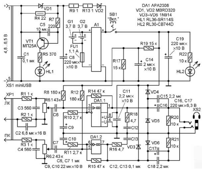 ЭНЦИКЛОПЕДИЯ РАДИОЭЛЕКТРОНИКИ И ЭЛЕКТРОТЕХНИКИ Усилитель для стереотелефонов с автономным питанием. Энциклопедия радиоэлектроники и электротехники Энциклопедия радиоэлектроники и электротехники / Усилители мощности транзисторные Большинство цифровых мобильных мультимедийных устройств имеют невысокий уровень выходного сигнала на контактах гнезда для подключения головных стереотелефонов. Обычно максимальный размах выходного сигнала при воспроизведении музыкальных файлов не превышает 1 В, а при проигрывании видеофильмов и прослушивании радиоспектаклей часто бывает понижен в 3...10 раз. При этом, если в тихой обстановке при использовании низкоомных телефонов еще можно что-то разобрать, то, например, в шумном помещении или в поезде фоновый шум может оказаться громче звука из головных телефонов. Чтобы прослушивать мультимедийные файлы в разной обстановке с оптимальной громкостью, можно воспользоваться описываемым ниже УМЗЧ с автономным питанием, который включают между источником сигнала и стереотелефонами. Об устройствах, которые можно использовать как УМЗЧ для стереотелефонов, в журнале уже рассказывалось [1,2], но они требуют подключения к источнику сетевого напряжения. Предлагаемый стереофонический УМЗЧ специально предназначен для работы на головные телефоны и питается от встроенной аккумуляторной батареи большой емкости, что обеспечивает его длительную работу. Схема усилителя представлена на рис. 1. Входную вилку устройства XP1 подключают к источнику сигнала ЗЧ. Через RC-фильтры R1C3 и R3C4 стереосигнал поступает на регулятор громкости - сдвоенный переменный резистор R6. Конденсатор С2 позволяет подключить УМЗЧ и источник сигнала к одному общему источнику питания постоянного тока, например, описанному в [3]. При этом возможно появление незначительных периодических "цифровых" помех в телефонах - в том случае, если общий провод выхода у источника стереосигнала не является минусом питания.