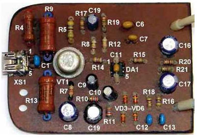 Микросхема APA2308 представляет собой сдвоенный высококачественный малошумящий ОУ, специально предназначенный для применения в качестве усилителя ЗЧ для головных стереотелефонов. Микросхема с индексом J выпускается в корпусе DIP-8, ас индексом K - SOP-8. Можно применить микросхему TL3414A (назначение выводов такое же, как у APA2з08). При отсутствии в продаже таких микросхем можно попытаться найти их в старых компьютерных устройствах для чтения/записи компакт-дисков. Вместо германиевого транзистора МП25А можно применить любой германиевый низкочастотный из серий МП25, МП26, ГТ402 (варианткорпуса - 2), атак-же зарубежные ГТ2307, SFT307, SFT352; вместо диодов Шоттки MBRD320 - MBRD330, MBRD340, MBRD835, 1N5820, 1 N5821, MBR320, MBR330, 15MQ040N, 30BQ040, а вместо диодов 1N914 -любые из 1 N4148, PMLL4148, PMLL4448, 1SS176, КД510А, а также КД521, КД522 с любым буквенным индексом. Для регулирования громкости применен высококачественный сдвоенный переменный резистор от импортного музыкального центра SANIO M-977DSR, его "холодные" выводы электрически соединены вместе внутри корпуса. Можно использовать любой аналогичный сдвоенный резистор сопротивлением 10...150 кОм (чем оно меньше, тем лучше). Все сигнальные провода, подключенные к регулятору громкости, должны быть экранированными, металлический экран соединяют с общим проводом. Остальные резисторы - С2-14, С2-23, МЛТ, ОМЛТ, РПМ или импортные аналоги. Под резисторами R9, R13 в монтажной плате просверлены дополнительные вентиляционные отверстия. Резисторы R1, R3 и конденсаторы C3, C4 припаяны к соответствующим выводам секций сдвоенного переменного резистора R6, резистор R22 - к контактам выключателя SB1. Неполярные конденсаторы - малогабаритные керамические, например, К10-50 или аналоги (те из них, что установлены в сигнальных цепях, необходимо проверить на отсутствие микрофонного эффекта, по этой причине нельзя устанавливать конденсаторы К10-7). Остальные конденсаторы - оксидные импортные высотой 4...6 мм. Светодиод RL36-SR114S (красного цвета свечения с линзой диаметром 3 мм) заменим любым из серий КИПД66, RL30N, L-934S. Вместо светодиода RL30-CB744D (синего цвета свечения) можно использовать, например, RL50-CB744D, RL30-WH744D. При монтаже HL2 учитывайте, что не все сверхъяркие светодиоды содержат защитные стабилитроны, поэтому при монтаже обязательно защищайте их от статического электричества соединяющей выводы временно установленной проволочной перемычкой. Выключатель SB1 - импортный малогабаритный кнопочный, одноименные контакты групп соединены параллельно. Розетка XS1 - miniUSB, это позволяет использовать для зарядки аккумуляторной батареи большинство зарядных устройств от мобильных мультимедийных аппаратов и системные блоки ПК. Можно установить также розетку microUSB, являющуюся стандартом для современных мобильных устройств связи, но эти розетки обладают неудовлетворительной надежностью. Контроллер A1 извлечен из неисправной телефонной литий-ионной аккумуляторной батареи Samsung (рис. 3). Он "умеет" отключать аккумулятор от цепи не только когда полностью заряжен, но и при его разрядке до минимально допустимого уровня, на что способны не все контроллеры аналогичного назначения.