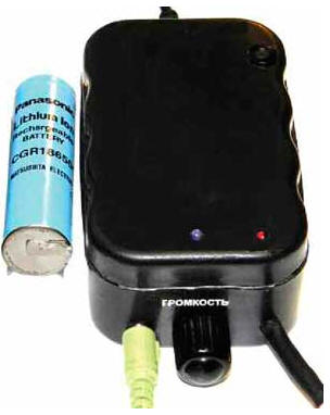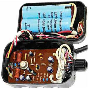 Поскольку данных о наличии защитного предохранителя нет, между контроллером и батареей установлен полимерный самовосстанавливающийся предохранитель на ток 1,1 А (подойдет любой низковольтный на ток 1,1...1,85 А). Стальные контактные лепестки контроллера облу-живают припоем с помощью флюса из ацетилсалициловой кислоты. К минусовому контакту припаивают предохранитель, к плюсовому - соответствующий провод от аккумуляторной батареи. Перед началом эксплуатации проверьте контроллер на исправность. Сделанные в Японии литий-ионные аккумуляторы Panasonic-Matsushita CGR18650C извлечены из ноутбучной батареи 2004 г. выпуска. Предварительно они были полностью заряжены, измеренная через восемь месяцев суммарная емкость аккумуляторов при разрядке током 1 А составила около 4500 мА·ч, что свидетельствует об их очень высоком качестве. Тут необходимо отметить, что среди продаваемых в розницу аккумуляторов типоразмера 18650 много низкокачественных и поддельных экземпляров (с большим током саморазрядки, в несколько раз меньшей, чем на этикетке, емкостью, с коротким сроком службы/хранения). Подделками, по мнению автора, являются все аккумуляторы 18650 с заявленной емкостью более 3000 мА·ч. При монтаже таких аккумуляторов будьте предельно осторожными - при коротком замыкании ток в цепи может достичь нескольких десятков ампер. Провода припаивают к приваренным к корпусу аккумулятора стальным лепесткам. К корпусу устройства их приклеивают двухсторонней липкой лентой. Корпус усилителя - пластмассовый, размерами 88x57x35 мм. Для крепления элементов в нем применены этиленвинилацетатный клей, а также "Квинтол" и БФ-2. Для лучшего сцепления склеиваемым пластиковым поверхностям рекомендуется придать шероховатость быстровращающимся сверлом или фрезой. В нижней части корпуса в качестве экрана приклеена липкая алюминиевая фольга, электрически соединенная с общим проводом, точка подключения - экран переменного резистора R6. Вид на компоновку узлов в корпусе показан на рис. 4, внешний вид усилителя - на рис. 5.