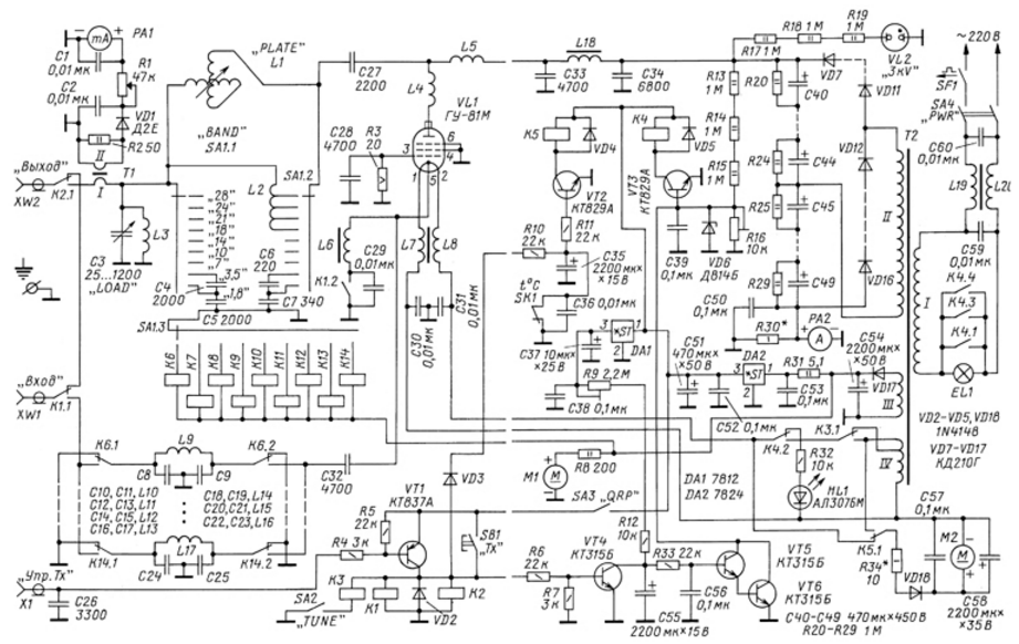 На входе усилителя включены диапазонные П-контуры L9-L17, C8-C25, переключаемые посредством реле К6- К14. Они обеспечивают согласование с любым импортным трансивером (даже не имеющим встроенного тюнера), обеспечивая КСВ по входу не хуже 1,5 на всех диапазонах. Время перехода УМ в спящий режим от 5 с до 15 мин устанавливает регулятор, который выведен на переднюю панель. Также введен режим работы усилителя при пониженной до 50 % выходной мощности ("TUNE"), который получается при снижении напряжения накала лампы VL1 до 9 В. При этом можно сколь угодно долго настраивать УМ и полноценно, без потери качества сигнала, работать в эфире. В усилителе применена параллельная схема питания анодной цепи. По сравнению с последовательной схемой она более безопасная, поскольку на элементах П-контура отсутствует высокое напряжение. Применение высокодобротной катушки индуктивности, подключаемой параллельно обмоткам вариометра на ВЧ-диапазонах, и отсутствие закорачиваемых витков катушки П-контура позволило также получить практически одинаковую выходную мощность на всех диапазонах. При включении УМ в сеть напряжение 220 В поступает через сетевой фильтр L19L20 на первичную обмотку трансформатора Т2 через галогеновую лампу EL1. Это обеспечивает мягкое включение усилителя, продлевая жизнь лампе ГУ-81М и другим элементам устройства. После зарядки конденсаторов С40-С49 высоковольтного выпрямителя до 2,5 кВ напряжение, снимаемое с делителя на резисторах R13- R16, поступает на базу транзистора VT3, транзистор открывается, срабатывает реле К4, замыкая своими контактами К4.1, К4.3, К4.4 галогеновую лампу EL1. На обмотку I трансформатора Т2 поступает полное напряжение сети. Особенность такого включения - малый гистерезис срабатывания/отпускания реле К4, что обеспечивает надежную защиту от различных перегрузок (короткое замыкание во вторичных цепях питания, цепи накала и замыканиях в обмотке трансформатора Т2). При возникновении любой из перечисленных неисправностей напряжение на базе транзистора VT3 уменьшится, реле К4 выключится и трансформатор Т2 вновь окажется подключенным к сети через лампу EL1, что ограничивает ток на уровне 1 А, предотвращая выход из строя лампы VL1 и УМ в целом. Управление работой усилителя осуществляется узлом на транзисторе VT1. При замыкании на общий провод контакта Х1 "Упр. ТХ" (ток в этой цепи 10 мА) транзистор открывается и реле К1, К2 подключают своими контактами вход и выход усилителя к ВЧ-разъемам XW1, XW2. Одновременно контакты реле К1.2 замыкают цепь катода лампы VL1 на общий провод, и усилитель переключается в режим передачи сигнала. В режиме "QRP" выключатель SA3 отключает питание транзистора VT1, что исключает переход усилителя в активный режим, и в антенну сигнал поступает непосредственно с выхода трансивера. Вентиляторы М1 и М2 поддерживают температуру УМ, исключающую перегрев элементов усилителя. При пониженном напряжении питания они работают практически бесшумно. В отсеке питания усилителя установлен компьютерный вентилятор М1 (12 В, 0,12 А, диаметр 80 мм), работающий при напряжении 7...8 В. В ламповом отсеке установлен вентилятор М2 размерами 150x150x37 мм на рабочее напряжение 24 В, который питается от цепи накала лампы VL1. В обычном режиме вентилятор работает при пониженном до 8...10 В напряжении питания, а при полной выходной мощности оно повышается до 20...22 В. Управляет работой 