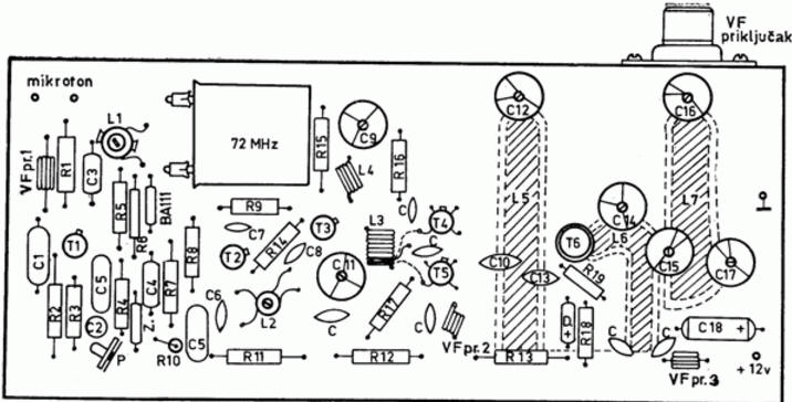 Поскольку частота 216 МГц уже довольно высокая, с целью уменьшения ее проникновения на выход передатчика из-за паразитных монтажных емкостей, выводы баз транзисторов Т4 и Т5 не пропускаются в отверстия платы на сторону печатных дорожек, а соединяются над платой навесным монтажом короткими, достаточными для пайки, выводами. Как это выполнено, показано на рис.7, на примере транзистора Т5.