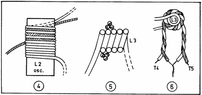 Намотке катушки L3 и парафазной катушке связи следует уделить повышенное внимание: сначала на оправке диаметром 3 мм наматывается 5 витков обмоточного провода диаметром 0,8 мм, затем свиваем два провода, можно монтажных одножильных с разноцветной изоляцией с диаметром по меди 0,15:0,2 мм. Намотку парафазной катушки связи (3 витка) следует произвести как показано на Рис.5, у "холодного" конца катушки L3, уложив на нее, сначала два витка катушки связи, а, поверх них, третий. Затем, начало одного провода катушки связи соединяется с концом второго (Рис.6), соединенные вместе провода припаиваются к общему проводу платы, оставшиеся - к базам транзисторов Т4, Т5. Таким образом, получается отвод от середины и симметричная катушка связи.