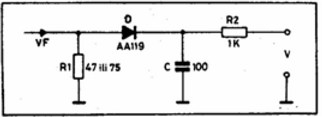 Настройка: коль скоро Вы собрали этот, в общем-то, простой передатчик, то, чтобы он работал, его необходимо настроить. Чтобы можно было оптимально согласовать с передатчиком антенну, необходимо изготовить РЧ приставку для измерителя, например, тестера. Схема такой приставки приведена на рис. 10. Если коаксиальный кабель подключается к передатчику без соединителя, детали приставки могут быть припаяны согласно Рис.11. Еще необходим безиндуктивный резистор сопротивлением 47 (50) или 75 Ом, в зависимости от сопротивления фидера Вашей антенны с мощностью рассеяния 0,5 Вт - эквивалент антенны. Диод АА119 - германиевый, его можно заменить любым другим (германиевым), способным работать на СВЧ. Конденсатор С - развязывающий по РЧ, его емкость может быть в пределах 100:200 пФ, миниатюрного типа, соединен со схемой приставки короткими выводами.