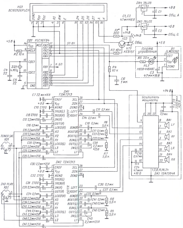 В этой конструкции управление осуществляется с пульта ДУ DVD плейера, используя кнопки управления телевизором (см. фото на рис. 1). От "старых добрых времен" у многих остались различные колонки и динамические головки, которые и выбросить жалко, и применить некуда. Популярные в свое время AC 35AC-01 или их модификации с успехом можно применить в качестве фронтальных. В этом случае сабвуфер становится ненужным, а в качестве центрального громкоговорителя с успехом можно использовать АС телевизора, тем более что ПДУ есть у всех современных телевизоров. Нелишне заметить, что качество дисков на рынке оставляет желать лучшего. Мне попадались диски формата 5.1 (особенно с переводом на русский язык), при воспроизведении которых звук центрального канала приходилось вообще выключать. При исключении центрального канала и сабвуфера (в настройках воспроизведения DVD) звуковая информация распределяется между фронтальными каналами. Известно, что из-за особенностей строения слухового аппарата человека локализация звуковых образов в стерео-панораме происходит в среднечастотном диапазоне. Поэтому в качестве тыловых можно использовать практически любые широкополосные динамические головки в акустическом оформлении. Замечено, что хотя оба источника звука (TV тюнер и DVD плейер) - цифровые с аналоговыми выходами, тембр у них все-таки разный, поэтому настройки тембра было решено сделать для каждого источника звука независимыми. В формате 5.1 номинальные уровни звука во фронтальных и тыловых каналах должны быть примерно одинаковыми. В формате же 2.0 тыловые каналы используются в качестве "подсветки", поэтому уровень в этих каналах должен быть понижен. Регулировки баланса также должны быть независимыми от режима работы. Во многих местностях, особенно в глубинке, качество электросети пока еще оставляет желать лучшего. Внезапное отключение и еще более внезапное включение света, перекос фаз, протекание потолка и т. п. происшествия наводят на мысль, что оставлять электроприборы постоянно включенными в сеть нецелесообразно. Хотя многие уже привыкли к тому, что подобные устройства постоянно готовы к употреблению, т. е. находятся в дежурном режиме. Поэтому было принято решение, помимо дежурного режима, иметь возможность полного отключения ДК от сети. А специально для забывчивых введен отключаемый таймер питания. Кроме того, при нахождении устройства в дежурном режиме свыше 5 мин при выключенном таймере на экран дисплея периодически выводится уведомление о том, что таймер выключен и, следовательно, устройство необходимо выключить принудительно. Управление ДК должно быть максимально простым, а индикация дисплея - информативной и интуитивно понятной. Поэтому решено оперативно управлять переключением рабочего и дежурного режимов, регулировкой общей громкости, выбором источника звука и его режимом. Остальные регулировки можно вызывать через меню. Детали должны быть доступны и дешевы; наконец, самодельная конструкция - это всегда собственный выбор и предпочтения, что немалого стоит для радиолюбителя. Все это реализовано в предлагаемой конструкции. Схема устройства Принципиальная схема устройства показана на рис. 2. Включение всех микросхем и модулей - типовое, рекомендованное производителями. Микросхема четырехканального УМЗЧ TDA7384 с максимальной кратков