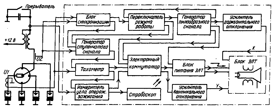 ЭНЦИКЛОПЕДИЯ РАДИОЭЛЕКТРОНИКИ И ЭЛЕКТРОТЕХНИКИ Электроника в автодиагностике. Энциклопедия радиоэлектроники и электротехники Энциклопедия радиоэлектроники и электротехники / Автомобиль. Электронные устройства Статистика показывает, что на долю электрооборудования приходится около 25 % всех неисправностей автомобиля, возникающих в процессе эксплуатации. Состояние системы зажигания существенно влияет на работу двигателя. Из-за износа ее элементов, ослабления соединений, эрозии контактов ухудшается запуск двигателя, увеличивается расход топлива, теряется мощность, уменьшается срок службы аккумуляторной батареи и повышается токсичность отработавших газов. Например, нарушение нормальной работы центробежного или вакуумного регулятора опережения зажигания вызывает увеличение расхода топлива на 6...8 %; одна неработающая свеча из четырех - падение мощности до 30 %; запаздывание момента зажигания на 5...8° против нормы снижает эффективную мощность двигателя на 8...12 %. Для диагностирования электрооборудования созданы специальные стенды. Одним из самых распространенных является осциллографическое устройство для испытания двигателей "Элкон S-200" производства ВНР. С помощью этого прибора можно выявить неисправности первичного и вторичного контуров системы зажигания путем оценки осциллограмм напряжения в них, измерить угол замкнутого состояния контактов прерывателя в интервале от 36 до 90°, угол опережения зажигания от 0 до 60°, пиковые напряжения в первичном контуре до 40 В и во вторичном до 40 кВ, измерить частоту вращения вала двигателя до 10000 мин-I, а также оценить разницу в мощности, развиваемой цилиндрами. Структурная схема прибора "Элкон S-200" представлена на рис. 1 в тексте. Исследуемые сигналы от распределителя автомобиля снимаются с индуктивного и емкостного датчиков Ul, U2.
