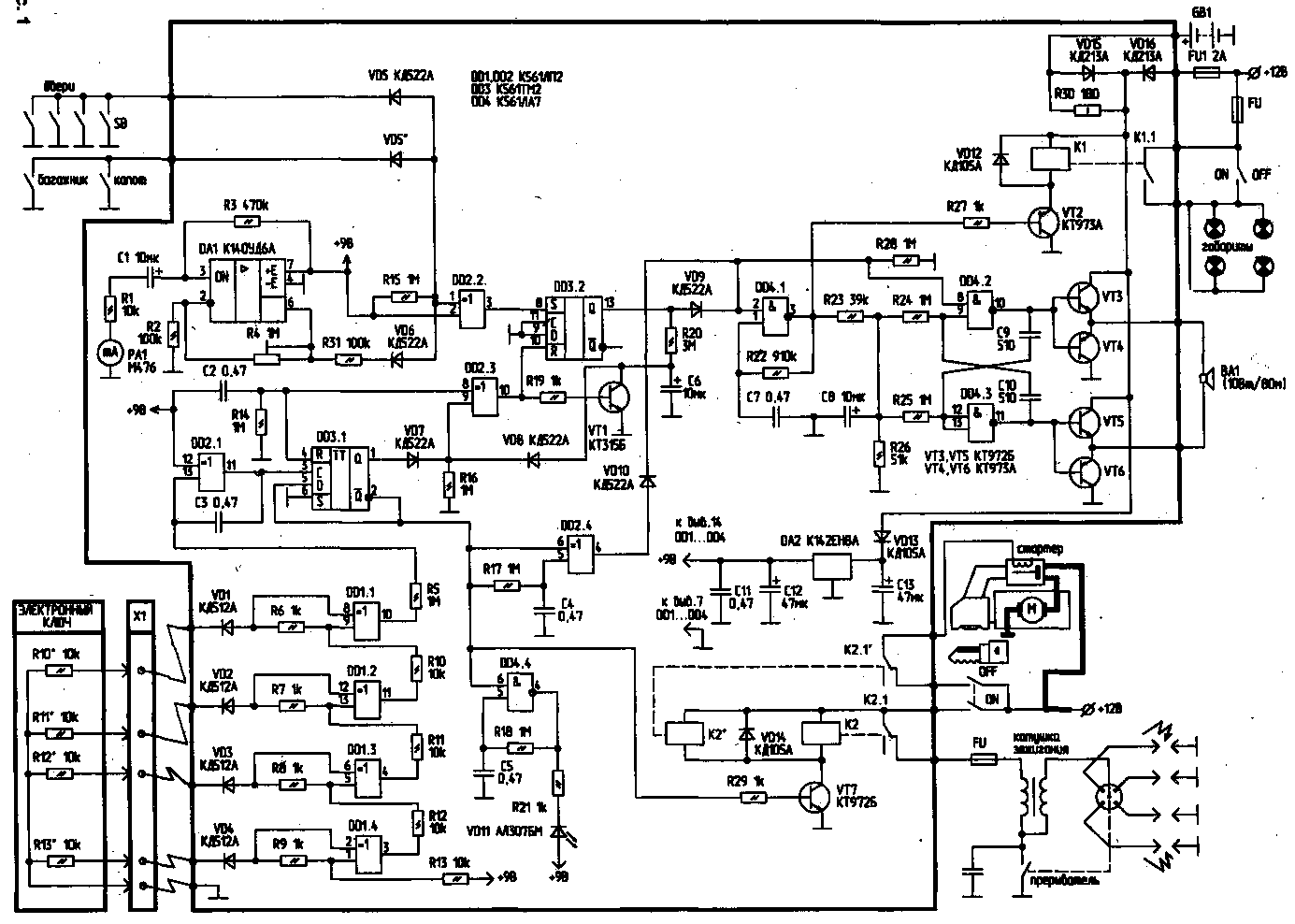 - DD2.3, R16, R19, R20, С6, VT1. VD8 -элементы выдержки времени (20с) в режиме "Тревога";