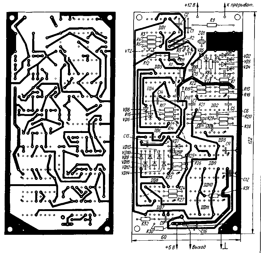 ЭНЦИКЛОПЕДИЯ РАДИОЭЛЕКТРОНИКИ И ЭЛЕКТРОТЕХНИКИ Цифровой автомат-регулятор угла ОЗ (часть 2). Энциклопедия радиоэлектроники и электротехники Энциклопедия радиоэлектроники и электротехники / Автомобиль. Зажигание Регулятор смонтирован на печатной плате из двустороннего фольгированного стеклотекстолита толщиной 1,5 мм. Чертеж платы показан на рис. 3. Резистор R9 - МЛТ-2, остальные - МЛТ-0,125. Конденсатор С16 - К52-1, остальные - КМ-6Б или КМ-5. Вместо диодов КД522А (VD1-VD4) подойдут любые кремниевые, рассчитанные на прямой ток не менее 100 мА (например, КД102А, КД509А), остальные можно заменить на КД503А, КД509А, КД512А. Транзисторы КТ3102Б заменимы любыми из серии КТ315 с коэффициентом передачи тока не менее 30. Номиналы конденсаторов и резисторов могут отличаться от указанных на ±20 %. Блок питания регулятора и цифрового октан-корректора должен обеспечивать напряжение 5 В±5 % при токе нагрузки 0,7 А и входном напряжении 8...14 В. Схема одного из вариантов блока показана на рис. 4. Стабилизатор DA1 устанавливают на теплоотводе общей площадью около 200 см2.