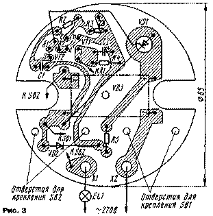 Если при таком режиме нажать кнопку SB1, даже кратковременно, конденсатор С2 быстро зарядится через резистор R1 и диод VD1 почти до напряжения питания однопереходного транзистора. В результате откроется транзистор VT1, его сопротивление сток-исток резко уменьшится (до нескольких сотен ом), отчего ток зарядки конденсатора С1 увеличится, а однопереходный транзистор VT2 станет открываться в начале каждой полуволны сетевого напряжения. В этом случае яркость свечения лампы будет максимальной в течение нескольких десятков секунд, пока конденсатор С2 медленно не разрядится через резистор R4 настолько, что сопротивление участка сток-исток начнет увеличиваться. Яркость ламп плавно уменьшится до установленного дежурного уровня. Кроме указанных на схеме, в устройстве можно применить детали: транзистор VT1 - КП301 с буквенными индексами Б-Г, VT2 - КТ117 с буквенными индексами А,В,Г; диод VD1 - любой выпрямительный или импульсный малогабаритный; стабилитрон VD2 на напряжение стабилизации 10...14 В; выпрямительный мост VD3 - КЦ402Б - КЦ402Г; конденсатор С1 - КЛС, КМ, С2 - К50-16. подстроечный резистор R3 - СП4-1, СПО, остальные - МЛТ. Кнопочные выключатели SB1 и SB2 (типа П2К) укреплены на плате с помощью длинных винтов МЗ с гайками.