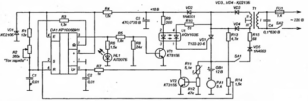 Момент повышения напряжения на аккумуляторе контролируется введением в схему отрицательной обратной связи по напряжению, с аккумулятора на ждущий мультивибратор на аналоговом таймере DA1 (рис. 1). Также в схему введен температурный датчик для защиты от перегрева силовых компонентов. Регулятор тока заряда позволяет установить начальный ток восстановления, исходя из значения емкости аккумулятора. Контроль среднего тока заряда ведется по гальваническому прибору - амперметру с линейной шкалой и внутренним шунтом. В показаниях амперметра токи алгебраически суммируются, поэтому показания среднего зарядного тока с учетом одновременной подачи с положительного тока отрицательного полупериода будут занижены. Не следует продолжительное время подавать на аккумулятор только отрицательный полу период тока - это приведет к разряду аккумулятора с переполюсовкой пластин. В заряженном аккумуляторе всегда идет саморазряд из-за разной плотности верхнего и нижнего уровня электролита в банке и других факторов, нахождение в буферном режиме подзарядки поддерживает аккумулятор в рабочем состоянии. Схема восстановления аккумуляторов переменным током (рис. 1) содержит небольшое количество радиодеталей. В состав схемы входит ждущий мультивибратор - формирователь синхронизированных с электросетью импульсов на аналоговом таймере DA1 типа КР1006ВИ1, усилитель амплитуды импульса на биполярном транзисторе обратной проводимости VT1, датчик температуры и усилитель напряжения отрицательной обратной связи VT2, узел питания и тиристорный регулятор зарядного тока. Напряжение синхронизации снимается с двухполупериодного выпрямителя на диодах VD3, VD4 и подается через делитель напряжения R13, R14 на вход 2 нижнего компаратора микросхемы DA1. Частота импульсов ждущего мультивибратора зависит от номиналов резисторов R1, R2 и конденсатора С1. В исходном состоянии на выходе 3 DA1 имеется высокий уровень напряжения при отсутствии на входе 2 DA1 напряжения выше1/3Uп, после его появления микросхема срабатывает с порогом, установленным резистором R14, на выходе появляется импульс с периодом 10 мс и длительностью, зависящей от положения регулятора R2, - времени заряда конденсатора С1. Резистор R1 определяет минимальную длительность выходных импульсов. Вывод 5 микросхемы имеет прямой доступ к точке 2/3Un внутреннего делителя напряжения. По мере роста напряжения на аккумуляторе в конце заряда открывается транзистор VT2 цепи отрицательной обратной связи и снижает напряжение на выводе 5 DA1, создается модификация схемы и длительность импульса уменьшается, время нахождения тиристора в открытом состоянии снижается. Импульс с выхода 3 таймера через резистор R5 поступает на вход усилителя на транзисторе VT1. Усиленный транзистором VT1 импульс через оптопару U1 подает на управляющий электрод тиристора VS1 отпирающее напряжение, синхронизированное с сетью, тиристор открывается и подает в цепь аккумулятора импульс двухполупериодного зарядного тока с длительностью, зависящей от положения регулятора тока R2. Резисторы R9, R10 защищают оптопару от перегрузок. Температура силовых элементов контролируется с помощью терморезистора R11, установленного в делителе напряжения цепи отрицательной обратной связи. Повышение температуры вызывает снижение сопротивления терморезистора и шунтирование т