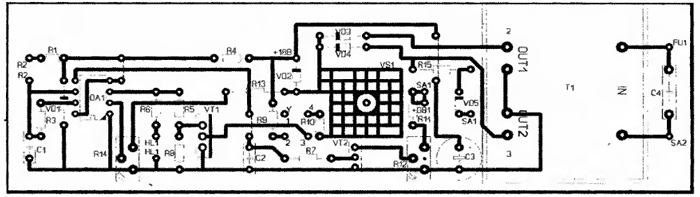 Элементы схемы, кроме выключателя, регулятора тока заряда, амперметра и предохранителя устанавливаются на печатной плате (рис. 2), остальное крепится в корпусе зарядного устройства. Технология восстановления аккумуляторов переменным током была разработана в 1999 г. и выполнена в изделии небольшой партией для патентного эксперимента. Литература
