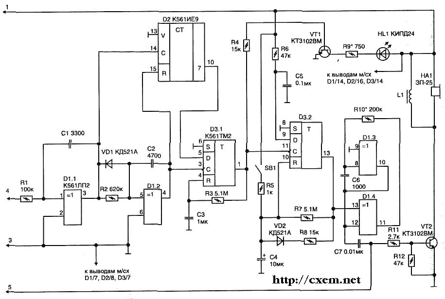 срабатывании любого из датчиков HL1 будет мигать с