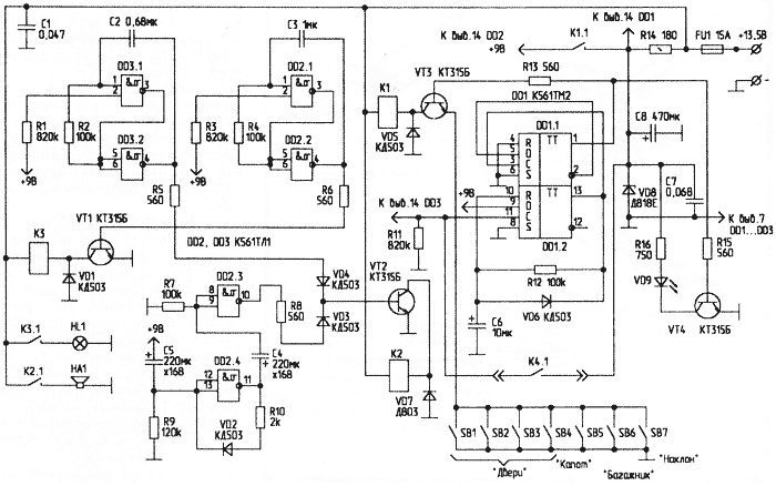 К эмиттеру VT3 подключена линейка датчиков SB1...SB7. Все датчики - контактного типа, и при срабатывании замыкаются "на массу". При этом открывается VT3, и срабатывает реле К1. Его контакты К1.1 замыкаются, и напряжение питания +9 В подается на DD2. На микросхеме DD2 собраны два мультивибратора. Мультивибратор на DD2.1, DD2.2 обеспечивает импульсный режим включения сигнальной лампы HL1 через VT1 и реле КЗ. Второй генератор на DD2.3, DD2.4 определяет периодичность включения звукового сигнала НА1 через VT2 и реле К2. Длительность сигнала определяется элементами С5, R9, а паузы - С4, R7.