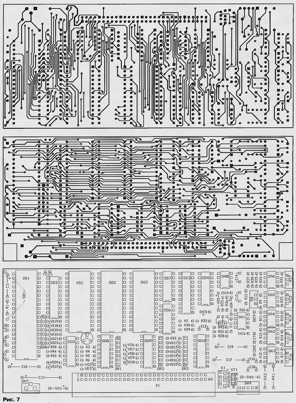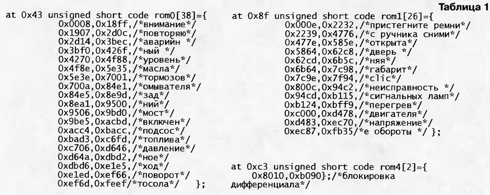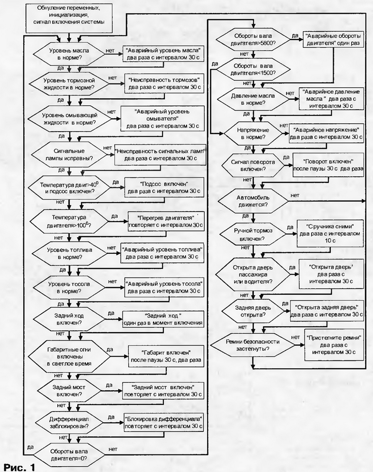 ЭНЦИКЛОПЕДИЯ РАДИОЭЛЕКТРОНИКИ И ЭЛЕКТРОТЕХНИКИ Автомобильный речевой информатор. Энциклопедия радиоэлектроники и электротехники Энциклопедия радиоэлектроники и электротехники / Автомобиль. Электронные устройства В статье описано устройство, которое способно голосом (вашим или другого человека) сообщать в словесной форме о неполадках в автомобиле и во время стоянки, и при движении. Прибор "опрашивает" датчики, размещенные в наиболее важных узлах машины, и по результатам опроса формирует речевые фрагменты, отражающие состояние контролируемых узлов. Автомобильные речевые информаторы, предназначенные для звукового оповещения о срабатывании различных датчиков или, иначе говоря, о состоянии систем автомобиля, выпускают уже давно [1]. Однако сравнительно небольшое число контролируемых параметров, привязанность к той или иной определенной модели автомобиля и довольно высокая цена ограничивают широкое распространение этих устройств. Известны и радиолюбительские разработки таких информаторов. В свое время были попытки применить для синтеза речи дельта-модуляцию [2; 3]. Подобные устройства, хотя и экономят ресурс памяти, но, собранные из дискретных элементов, были очень сложны. Непрост и сам процесс записи звука в ПЗУ. Часто изготовить записывающий узел было труднее, чем воспроизводящий. В то же время рост объема памяти EPROM (электрическая запись и "ультрафиолетовое" стирание) и их удешевление позволяют реализовать запись речи, не прибегая к сложному кодированию и применению специализированных микросхем. Это, во-первых, облегчает последующее цифро-аналоговое преобразование и, во-вторых, упрощает как программную и аппаратную части, так и сам процесс записи звука в ПЗУ. Требуются лишь микрофон, звуковая карта и простейшая программа, которыми комплектуют операционную систему Windows. Описываемый здесь речевой информатор может быть смонтирован на автомобилях отечественного и иностранного производства. В нем запрограммировано 22 слова и словосочетания, имеющих самостоятельное смысловое значение. Схема программы изображена на рис. 1. В основных узлах автомобиля установлены датчики, формирующие при срабатывании аварийные сигналы. Датчики подключены к логическому узлу, соединенному с микропроцессором, который постоянно опрашивает датчики и при опознавании того или иного аварийного сигнала принимает решение на воспроизведение соответствующей предупреждающей фразы. Как работает речевой информатор? При включении питания (а также при нажатии на кнопку "Обнуление") звучит характерный тональный сигнал, сообщающий о том, что система включена и работает нормально. Далее опрашиваются датчики тех узлов, которые положено проверять до выезда из гаража. Если один из датчиков формирует аварийный сигнал, информатор произносит слово "Внимание" и вслед за ним соответствующую фразу. В том случае, когда через 30 с положение не изменилось, звучит слово "Повторяю" и снова воспроизводится то же сообщение. Фраза "Задний ход" предназначена для тех, кто ездит на автомобилях ВАЗ моделей 2108 и 2109, у которых положения первой и задней передач находятся рядом, и начинающие водители нередко их путают. Слова "Блокировка дифференциала" и "Задний мост включен" - адресованы владельцам полноприводных машин с принудительным блокированием дифференциала, и звуча