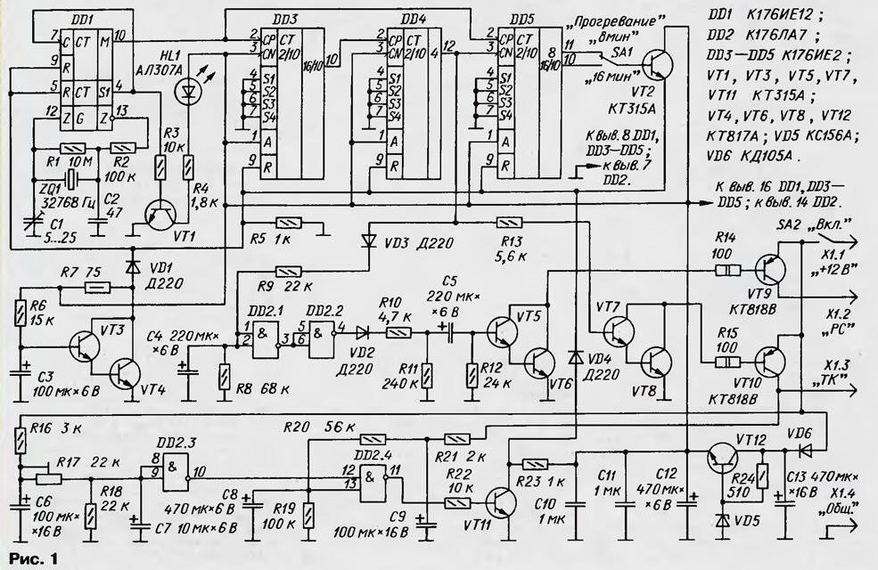 ЭНЦИКЛОПЕДИЯ РАДИОЭЛЕКТРОНИКИ И ЭЛЕКТРОТЕХНИКИ Автомат-прогреватель двигателя. Энциклопедия радиоэлектроники и электротехники Энциклопедия радиоэлектроники и электротехники / Автомобиль. Электронные устройства Это устройство предназначено для поддержания двигателя дизельного автомобиля прогретым в холодное время года в отсутствие его хозяина. Многим владельцам таких машин приходилось сталкиваться с проблемой запуска дизеля в морозные дни, что обычно связано с довольно высоким значением температуры замерзания распространенных марок дизельного топлива. Дорогие модели автомобилей оснащены специальным автоматом, позволяющим без труда запускать и прогревать дизельный двигатель в заданное время или через заданные промежутки времени. Отталкиваясь от этой идеи, я разработал устройство, которое через заданные промежутки времени запускает дизель, дает ему поработать некоторое время и выключает. Автомат-прогреватель был изготовлен в нескольких экземплярах и показал надежную работу. В частности, уже три зимы он успешно эксплуатируется на автомобиле "Ford Transit". Автомат представляет собой таймер с исполнительными узлами, работающий в следующем режиме: двухчасовая пауза, после чего включается зажигание через 6...8 с, необходимых для прогревания накальных свечей, включается стартер, двигатель запускается; он работает в течение 7 или 15 мин, после чего зажигание выключается, двигатель останавливается и следует новая двухчасовая пауза. Устройство смонтировано на автомобиле и питается от бортовой сети напряжением 12 В; ток, потребляемый в течение двухчасовой паузы, - не более 200 мА. Большинство дизелей оборудовано специальными накальными свечами, предназначенными для подогревания топлива и установленными в цилиндрах (по одной на цилиндр), или одной свечой на впускном патрубке. Для запуска зимой современного дизельного двигателя сначала включают зажигание - происходит открывание электромагнитного клапана подачи топлива. Далее, в зависимости от способа включения накал ьных свечей, возможны два варианта: 1. После включения зажигания напряжение поступает на термоконтактное реле управления накальными свечами. Если температура топлива слишком низкая, происходит срабатывание реле и включение свечей. После прогревания топлива реле отключает свечи, т. е. после включения зажигания надо выдержать паузу 2...8 с до выключения контрольной лампы и включить стартор. 2. Реле управления свечами и, таким образом, сами свечи включают специальной кнопкой, вынесенной на панель приборов. Включение реле возможно только после включения зажигания. Выключаются свечи тем же реле посредством термоконтактного датчика после прогревания топлива или отпусканием кнопки. Короче говоря, после включения зажигания нажимают на кнопку и выдерживают паузу (те же 2...8 с) до выключения контрольной лампы. Теперь включают стартер, и если двигатель исправен и правильно отрегулирован, после нескольких оборотов коленчатого вала происходит его запуск и работа на устойчивой частоте вращения. Для работы с автоматом-прогревателем водитель должен включить питание устройства и в варианте 2 - питание свечей (замкнуть контакты кнопки). Все остальное выполняет автоматика. Если кнопка без фиксации в нажатом положении, нужно параллельно ее контактам подключить тумблер и ус