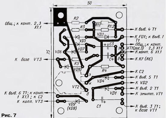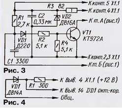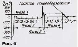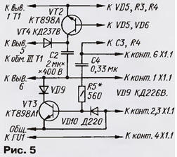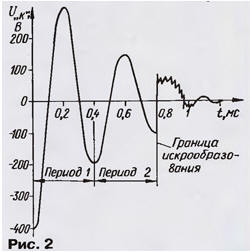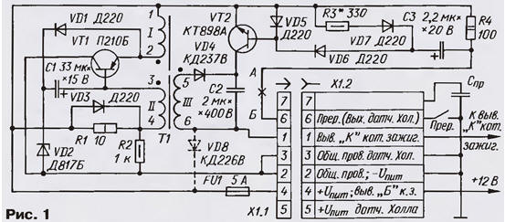 ЭНЦИКЛОПЕДИЯ РАДИОЭЛЕКТРОНИКИ И ЭЛЕКТРОТЕХНИКИ Модернизация блока зажигания. Энциклопедия радиоэлектроники и электротехники Энциклопедия радиоэлектроники и электротехники / Автомобиль. Зажигание Многолетняя эксплуатация на отечественных и зарубежных автомобилях электронных блоков зажигания, собранных по статье Ю. Сверчкова [1] усовершенствованиями, предложенными Г. Карасевым [2], показала, что эти усовершенствования вместе с положительными качествами (увеличение длительности искры, например) приводят к появлению сбоев в искрообразовании на частоте вращения коленчатого вала 3000 мин-1 и более. Более того, оказалось, что полностью устранить эти сбои исключительно трудно, даже если точно следовать рекомендациям, данным в [3]. На стадии налаживания блока было установлено, что появление на зажиме "К" катушки зажигания полуволны напряжения после закрывания диода VD5 (обозначения элементов здесь и далее соответствуют схеме на рис. 1 в [2]) крайне нестабильно. Характеристики этой полуволны сильно зависят не только от номиналов конденсатора С2 и резистора R4, но и от напряжения питания, и в еще большей степени от ширины искрового промежутка. После установки на автомобиль блока, отрегулированного и работающего на стенде без сбоев в интервале частоты формирователя импульсов 10...200 Гц с двумя периодами разрядки конденсатора C3 при напряжении питания 14 В, искровом промежутке 7 мм, сбои в искрообразовании проявлялись на высоких оборотах коленчатого вала. Не помогало ни различное сочетание значений емкости конденсатора С2 (от 0,01 до 0,047 мкФ) и сопротивления резистора R4 (от 300 до 1500 Ом), ни даже подборка тринистора VS1 по току управления. Сбои полностью исчезали при номинале резистора R4 свыше 1,5 кОм и конденсатора С2 0,01 мкФ, т. е. при однопериодном искрообразовании в соответствии со схемой блока Ю. Сверчкова. Несколько лет блок безотказно работал с удаленной цепью удлинения искры C2R3R4VD6. Анализ осциллограмм напряжения на зажиме "К" катушки зажигания, полученных на установленном в автомобиль блоке зажигания с цепью удлинения искры, при различной частоте искрообразования, приводит к выводу, что причина появления сбоев в искрообразовании кроется в нестабильности скорости нарастания полуволны напряжения на конденсаторе C3, следующей за закрыванием диода VD5. Поэтому приходится признать, что метод увеличения длительности искрового разряда тринисторно-конденсаторным блоком путем подачи на управляющий электрод тринистора повторного открывающего импульса, формируемого остаточным напряжением на накопительном конденсаторе, для практического использования в автомобиле непригоден. Реализовать на практике идею увеличения длительности искрового разряда в конденсаторном блоке зажигания [1] удалось благодаря использованию вместо тринистора мощного составного транзистора КТ898А, специально разработанного для автомобильных систем зажигания. Схема модернизированного блока показана здесь на рис.1 (далее обозначения элементов соответствуют этой схеме). Цепь управления разрядкой накопительного конденсатора С2 существенно упрощена по сравнению с [2]. Постоянную времени зарядки управляющего конденсатора C3 определяют номиналы элементов C3 и R3 и сопротивление диода VD7, а разрядки - C3 и R4, VD6 и сопротивление эмиттерного перехода транзистора VT2. Ток базы транзи