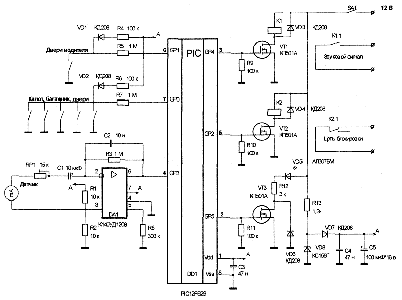 ЭНЦИКЛОПЕДИЯ РАДИОЭЛЕКТРОНИКИ И ЭЛЕКТРОТЕХНИКИ Автомобильные охранные системы на микроконтроллере PIC12F629. Энциклопедия радиоэлектроники и электротехники Энциклопедия радиоэлектроники и электротехники / Автомобиль. Охранные устройства и сигнализация В продолжении темы автомобильных охранных систем на микроконтроллерах фирмы MICROCHIP [1], [2] предлагается еще две схемы автомобильных охранных систем на PIC12F629, модернизированных с целью повышения надежности работы как в неблагоприятных климатических условиях, так и в условиях взлома автомобиля, при попытках вывода из строя автомобильной охранной системы. Схема на рис. 1 представляет собой модернизированный вариант автомобильной охранной системы АОС [1] с использованием новой элементной базы. Модернизация коснулась коррекции алгоритма работы охранной системы для микроконтроллера PIC12F629, изменения входных цепей приема сигналов от дверных включателей освещения, концевых выключателей капота и багажника, изменения схемы подключения светодиода.