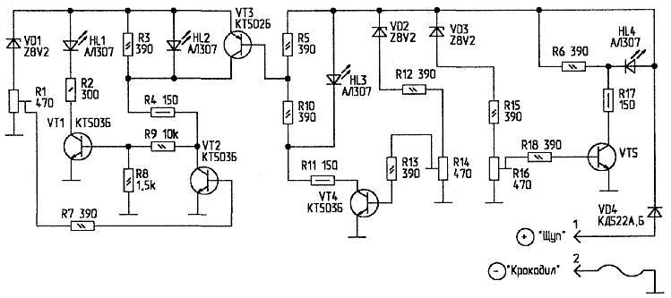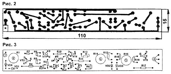 На элементах VT1, R2, R8, R9, HL1 выполнен каскад индикации нижнего уровня напряжения. Когда светодиод HL2 не горит, ток в базу VT1 поступает по цепи R3-R4-R9. Транзистор VT1 открывается, и загорается светодиод HL1. При повышении входного напряжения увеличивается напряжение на базе VT2, поступающее с R1, что приводит к открыванию VT2 и загоранию HL2. При этом закрывается VT1, и HL1 гаснет. R3 предназначен для "обострения" порога переключения VT1 и VT2. Цепь VD1-R1 представляет собой пороговую схему. При превышении входным напряжением напряжения стабилизации VD1, через R1 начинает протекать ток. Соответственно, увеличивается напряжение, снимаемое с движка R1 для управления VT2. Аналогично работают цепи VD2-R12-R14 и VD3-R15-R16. Применение стабилитронов позволило увеличить крутизну срабатывания ключей на VT2, VT4, VT5. Регулировка каскада на VT4 осуществляется подстроечным резистором R14, который задает уровень зажигания HL3. К HL3 подключен делитель R10-R5, управляющий ключом на VT3. Таким образом, при загорании HL3 открывается VT3 и гаснет HL2. При этом VT2 открыт, VT1 закрыт, и HL1 также не горит. На VT5 собран ключ, который индицирует превышение напряжением верхнего уровня. Порог открывания VT5 устанавливается R16. При зажигании HL4 горит и HL3. Схема собрана на печатной плате из одностороннего стеклотекстолита размером 110x15 мм (рис.2). Расположение деталей на плате показано на рис.3. После сборки из исправных деталей от регулируемого блока питания, напряжение 10,25 В подается на клеммы 1 ( "Щуп") и 2 ("Крокодил"). Вращением R1 добиваются равномерного свечения HL1 и HL2. Затем, подав напряжение 12 В, регулируют R14 до начала свечения HL3. Повысив напряжение до 15,5 В, регулируют R16 до загорания HL4. После настройки, оси R1, R14, R16 желательно законтрить цапонлаком. Устройство готово к работе. В комплексе устройство работает так. HL1 загорается при входном напряжении от 6 В до уровня зажигания HL2. HL2 загорается при напряжении, установленном R1. HL3 загорается при уровне, выставленном R14, HL4 - R16. Если горит HL4, то HL3 тоже горит. При зажигании HL3 и HL4, HL1 и HL2 гаснут. Для уплотнения монтажа все резисторы, за исключением R4, R11, R17, установлены в вертикальном положении. Диоды VD1...VD4 - тоже в вертикальном положении. Транзисторы VT1...VT5 нужно выбирать с β не ниже 80. Светодиоды - малогабаритные, импортные. Можно поставить АЛ307, но при этом придется подточить их боковые части надфилем. Для наглядности лучше всего применить разноцветные светодиоды. Впаивать светодиоды нужно в последнюю очередь, и так, чтобы они были чуть выше всех остальных элементов. К выводу 2 на плате припаивают три провода МГТФ. Нужно сплести их, и возле выхода из платы завязать узел, чтобы зафиксировать их в корпусе. К выводу 1 платы следует припаять любой заостренный щуп длиной 30...50 мм. После настройки устройства и проверки на работоспособность, нужно изготовить (склеить из картона вокруг печатной платы) "опалубку" корпуса, так чтобы ниже платы оставались свободными 5 мм, а вверху - 20 мм. Далее весь объем заливается эпоксидным клеем до уровня светодиодов. Они должны выступать из клея на 1,5...2 мм. После высыхания клея сверху каркас переворачивают, и заливают плату с другой стороны. Данная конструкция имеет максимальную прочность и надежность. При отсутствии стеклотекстолита схему можно собрать на плотном электрокартоне. Проколов отверстия под детали шилом, устанавливают элементы, а связи между ними 