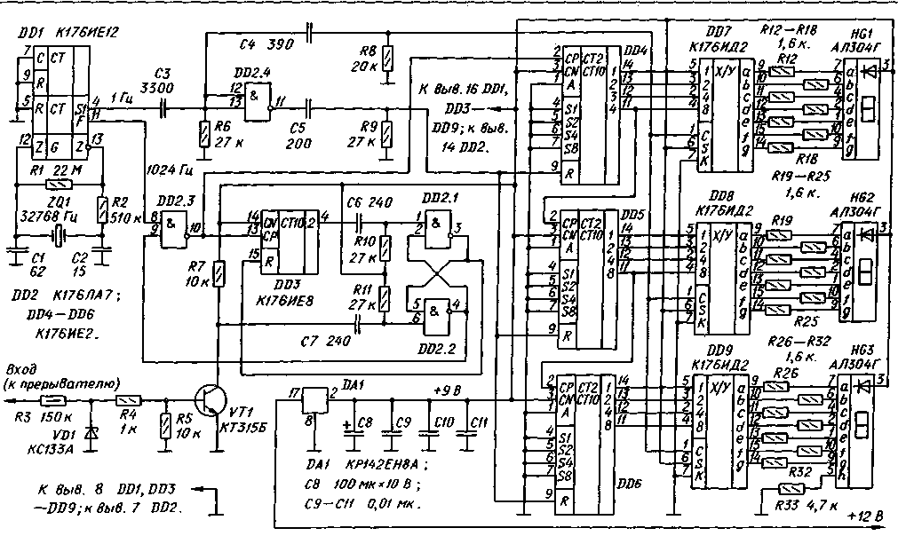 Процесс записи будет продолжаться в течение секунды, т. е. до того момента, когда на выходе S1 счетчика DD1 появится очередной положительный перепад напряжения. В этот момент информация, накопившаяся в счетчиках DD4-DD6, будет переписана в буферные регистры преобразователей кода DD7-DD9, а вскоре счетчики DD4-DD6 обнулит по входу R сигнал с цепи C5R9. Сразу после спада импульса высокого уровня на входе счетчиков DD4-DD6 начнется новый цикл записи и т. д. Для обеспечения необходимой временной задержки между моментами перезаписи информации из счетчиков DD4-DD6 в буферные регистры преобразователя кода DD7-DD9 и обнуления счетчиков служат дифференцирующие цепи C3R6, C4R8, C5R9 и элемент DD2.4.