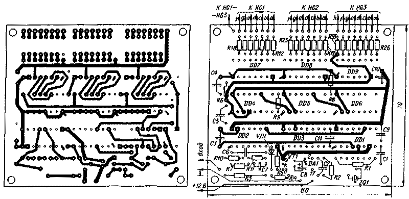 Все детали тахометра, кроме стабилизатора напряжения DA1 и индикаторов HG1-HG3, размещены на печатной плате из двустороннего фольгированного стек-лотекстолита. Чертеж печатной платы и расположение деталей на ней представлены на рис. 2. Тахометр некритичен к типу применяемых деталей. Номиналы резисторов и конденсаторов могут отличаться от указанных на схеме на ±20 %.