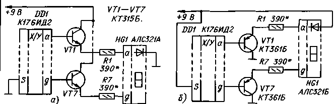 При необходимости можно использовать индикаторы и с более крупными цифрами, например, АЛС321А, АЛС321Б, АЛС324А, АЛС324Б. Ток, потребляемый каждым их элементом, значительно больше - до 20 мА, поэтому для обеспечения запаса яркости свечения выходной ток дешифраторов необходимо усилить. Схемы усилителей тока для индикаторов серий АЛС321 и АЛС324 представлены на рис. 3, а и б. ![]() Обращаем внимание на то, что при использовании индикаторов с общим катодом АЛС321А и АЛС324А на вход S преобразователей кода DD7-DD9 следует подавать напряжение низкого уровня (выводы 6 соединить с общим проводом).