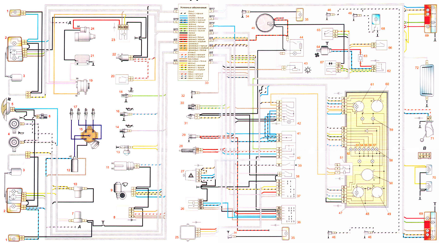 В. порядок условной нумерации штекеров в колодках трехрычажного переключателя и комбинации приборов.